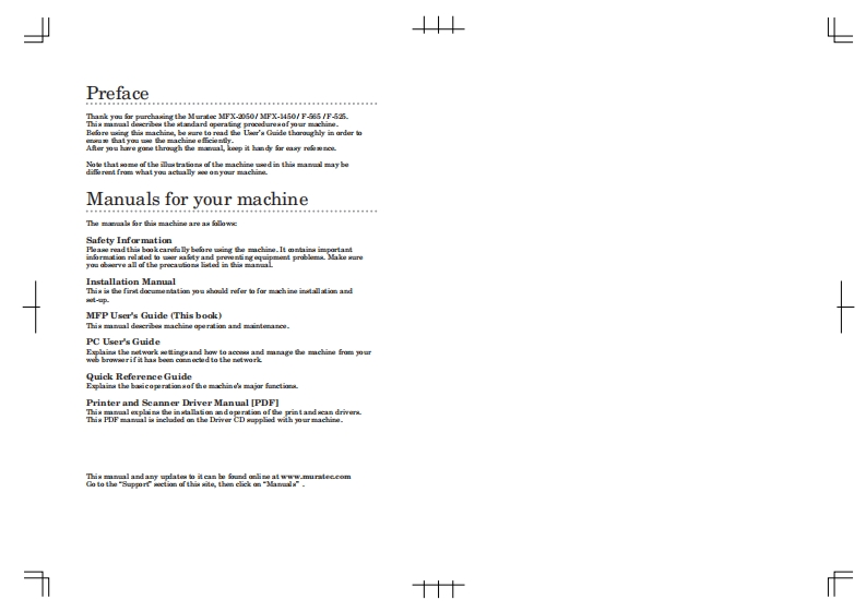 44LmuratecmuratecMFX-2050/MFX-145D/F-56S/MFX-2050/MFX-1450F-565/F-525MFP User's GuideMFP User's Guidemuratechtp:/ww.mu四ea.的mMuratec America,Inc31981927263301 EastPlno Parkway.Sute 100Plno,75074Pat他t4g灯40Co越4 orar nnbec4送器什F