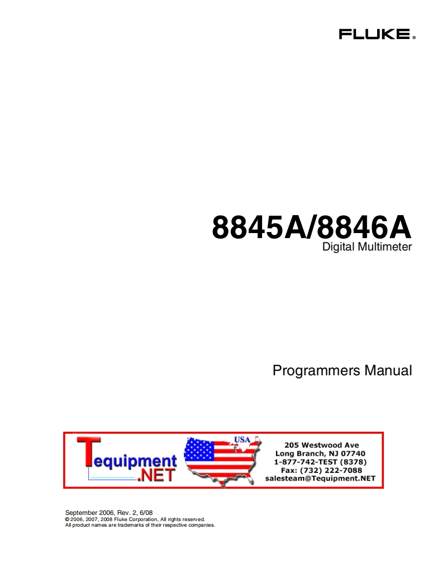 =LUK三。8845AV8846ADigital MultimeterProgrammers Manual205 Westwood AvelequipntLong Branch,NJ 077401-877-742-TEST(8378)Fax:(732)222-7088salesteam@Tequipment.NETSeptember 2006,Rev.2.6/082006,2007,2008 Fluke Corporation,All rights reserved.All product names are trademarks of their respective companies.