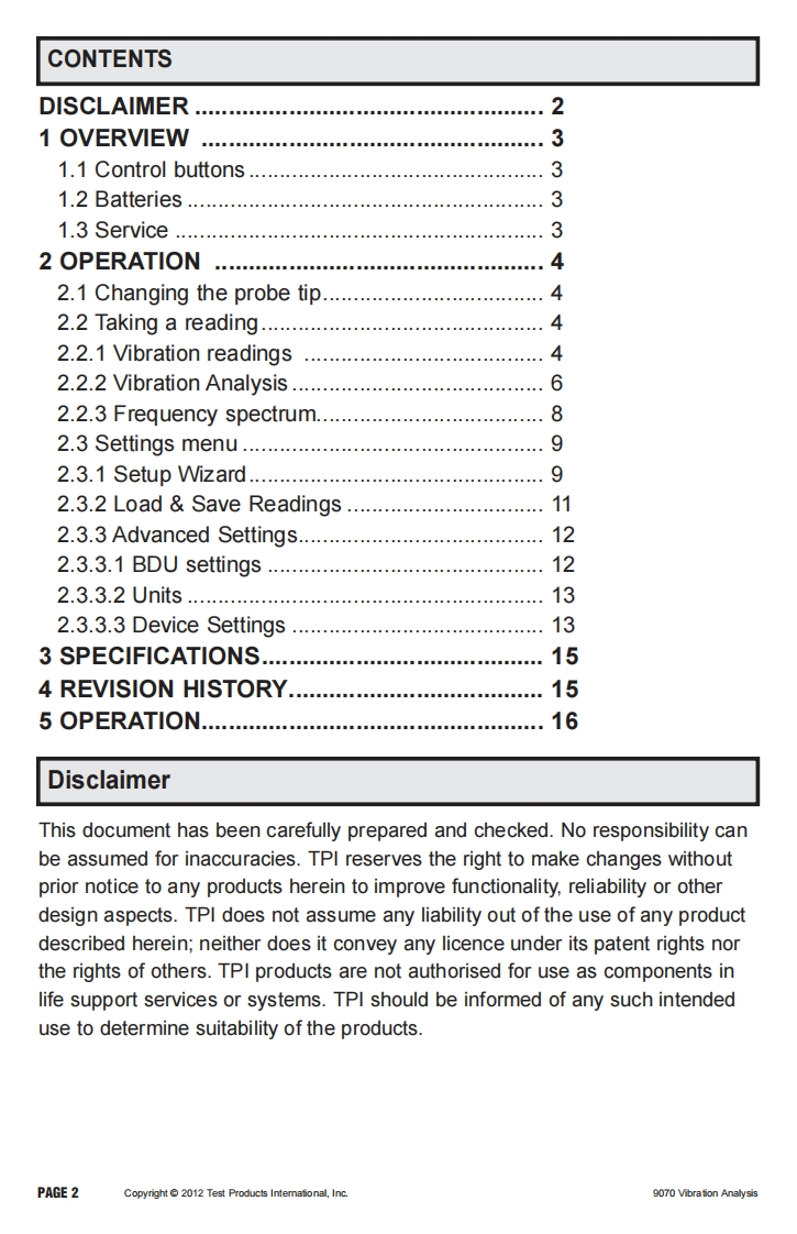 9070 Smart Vibration MeterInstruction ManualOverall machine andbearing conditions:0.473ISOvibration values are displayedin/swith color coded alarm levelsfor ISO values and Bearing250.4Damage(BDU).BDUgEasy vibrationanalysis:1X (unbalance)0.140.210.122X(misalignment)3X (looseness)1X2X3XRun Speed:1450 RPM6i9070Identify complex800 Line0.473ISOissues:1450In/s100 to 800-lineRPMspectrum with250.4zoom and cursor.为BDUgSmart Vibration MeterCondition BasedMonitoringPower ON MeasureNavigation Cursor MovementMenuSetupScreen Select Push Hold for2 seconds for Menu SetupWaterproofIP679070 Vibration AnalysisCopyright 2012 Test Products Intemational,Inc.PAGE 1