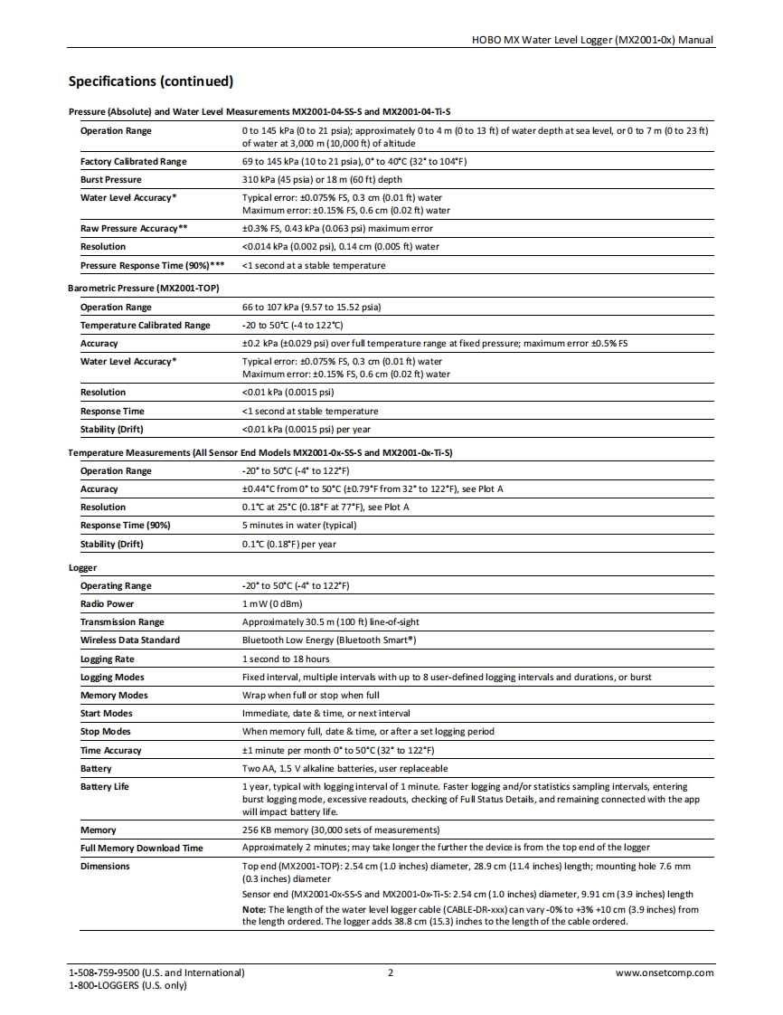 HOBOHOBO MX Water Level Logger(MX2001-0x)ManualData LoggersThe HOBO MX water level logger is used for monitoring changing water levels in a widerange of applications,including streams,lakes,wetlands,tidal areas,and groundwater.This BluetoothLow Energy-enabled logger is designed for wireless communication witha phone,tablet,or computer.Using the HOBOconnect app,you can easily configurethe logger and read it out-all from its deployed location-to your mobile device orcomputer where you can view the logged data or export it for further analysis.With theapp,you can also set a reference water level and water density,configure up to 8logging intervals,log statistics,configure an alarm to trip at thresholds you specify,orset up burst logging in which data is logged at a different interval when sensor readingsare above or below certain limits.This logger features a ceramic pressure sensor,dura ble housing,and an integrated barometric pressure sensor for barometriccompensation in the logger,which allows for direct water level readout without needingHOBO MX Water Levelto do any post processing.An optional cap is also available for deployment in existingLoggerwells or stilling wells.Without cumbersome vent tubes or desiccants to maintain andModels:convenient data retrieval,this easy-to-use logger is an ideal solution for water levelstudies and research.·WMK2001-01-S5orMX2001-01-Ti(Titanium),9-meter/30-footdepth)SpecificationswM2001-02-S5,30-meter,/100foot depthPressure (Absolute)and Water Level Measurements MX2001-01-5S-S and MX2001-01-Ti-SwM2001-03-s5,76-meter,/250-foot depthOperation Range0 to 207 kPa(0 to 30 psia);approximately 0 to9 m (0 to 30 ft)of·wK2001-04-S5orMX2001-04-Tiwater depth at sea level,or 0 to 12 m(0 to 40 ft)of water at(Titanium),4-meter/13-foot3,000 m (10,000 ft)of altitudedepthFactory Calibrated Range69 to 207 kPa (10 to 30 psia),0*to 40"C(32*to 104"F)Note:Each model consists of asensor end (MX2001-0x-S5-S orBurst Pressure310 kPa(45 psia)or 18 m(60 ft)depthMX2001-0x-Ti-5)and a top endWater Level Accuracy*Typical error:0.05%FS,0.5 cm (0.015 ft)water(MX2001-T0P.Maximum error:0.1%FS,1.0 cm (0.03 ft)waterRaw Pressure Accuracy**0.3%FS,0.62 kPa (0.09 psi)maximum errorIncluded Items:Resolution<0.02kPa(0.003psi),0.21cm(0.007ft)water·Two AA1.5 V Batteries·Grease packetPressure Response Time (90%)***<1 second at a stable temperature·5cm(2indh)grommetPressure (Absolute)and Water Level Measurements MX2001-02-SS-SLogger consisting of a top endand sensor end connected by aOperation Range0 to 400 kPa(0 to 58 psia);approximately 0 to 30.6 m(0 to 100 ft)cable in desired length (orderedof water depth at sea level,or 0 to 33.6 m (0 to 111 ft)of water atseparately)3,000 m (10,000 ft)of altitudeFactory Calibrated Range69 to 400 kPa (10 to 58 psia),0*to 40"C(32*to 104"F)Required Items:Burst Pressure500 kPa (72.5 psia)or 40.8 m (134 ft)depth·HOBOconnect appWater Level Accuracy*Typical error:0.05%FS,1.5 cm (0.05 ft)waterMobile device with BluetoothMaximum error