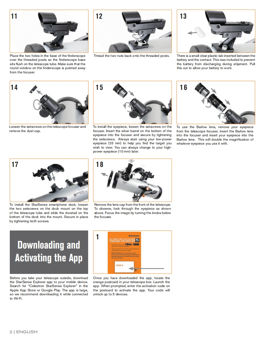 CELESTRON2StarSenseExplorer LT114AZQuick SetupGuideENGLISH1TE/#22452Unpack your telescope and verify that all partsTo set up the tripod,spread the legs outward untilare present.Your StarSense Explorer LT includes:they are fully extended and push down the centera telescope tube with altitude slow motion rodleg brace.attached,a lens cap,an accessory bag,a tripodwith alt-azimuth yoke mount and center leg braceattached,two tube mounting screws,a StarSensesmartphone dock,two eyepieces,a 2x Barlowlens,an eyepiece accessory tray,a StarPointerfinderscope and StarSense Explorer app code card.3Extend the center portion of each of the three tripodCheck to ensure that all three legs are the samelegs down about 6 to 12 inches.Use the tighteningheight once extended to provide a level platform forscrew on each leg to secure the extended leg inthe telescope.place56Place the eyepiece accessory tray on top of theLoosen the knob on the altitude rod guide on theSlide the altitude rod into the rod guide on thetripod's center leg brace.Thread the tray into theside of the yoke mount so the hole is unobstructed.mount and lower the altitude hubs on the telescopethreaded hole in the center of the leg brace until ittube into the cradles on the top of each yoke amm.is fully seated.NOTE:If necessary,rotate the accessory traycounterclockwise until the accessory holesare not covered by the leg brace arms asshown here.8910Tighten the altitude rod guide screw to hold theInsert the two tube mounting screws through theTo install the finderscope,remove the two silvertelescope in place.yoke mount and into the hubs on the telescope tubenuts from the threaded posts on the top of the tube,to secure it in place.near the focuser.ENGUSH1