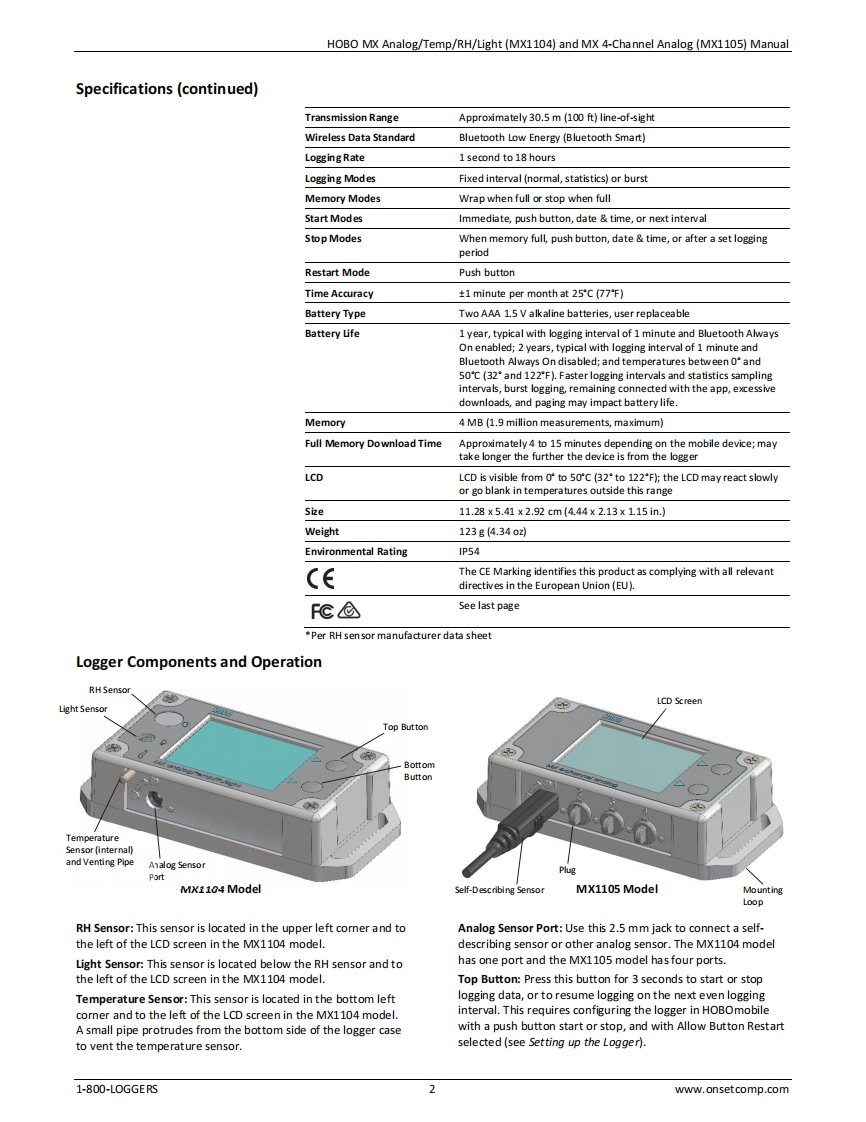 HOBO MX Analog/Temp/RH/Light (MX1104)andMX 4-Channel Analog (MX1105)Data Logger ManualHOBOData LoggersThe HOBO MX Analog/Temp/RH/Light (MX1104)and HOBO MX 4-Channel Analog(MX1105)data loggers measure and transmit data wirelessly from indoor environments to mobile devices4825using Bluetooth Low Energy technology.The MX1104 model has integrated temperature,relative humidity (RH),and light intensity sensors and one analog input while the MX1105RNPmodel has four analog inputs.Both models support a wide variety of external sensors(soldseparately),including self-describing temperature,split-core AC current transformer,4-20 mA4input,and DC voltage input sensors.The self-describing sensors are designed with integratedMX1105 Model Shownstrain relief for a secure connection to the loggers and are automatically detected by theHOBOmobile app for easy setup.Using the app,you can configure the loggers,read out andview data,and export the data for further analysis.The loggers can calculate minimum,maximum,average,and standard deviation statistics and can also be configured to trip audibleor visual alarms at thresholds you specify.In addition,both loggers support burst logging inwhich data is logged at a different interval when sensor readings are above or below certainHOBO MX1104 andlimits.These compact loggers also have built-in LCD screens to display current sensor readings,logging status,battery use,memory consumption,and more.MX1105 Data LoggersModels:Specifications.Analog/Temp/RH/LightTemperature Sensor(MX1104)(MX1104).4-Channel AnalogRange-20°to70C(-4to158F(MX1105)】Accuracy±0.20°℃from0°to50℃(t0.36*F from32to122F)Included Items:Resolution0.002*℃at25℃(0.004Fat77F日)·Tie wrapsDrift<0.1*C (0.18*F)per year.Two AAA 1.5 V alkalinebatteries(installed)RH Sensor*(MX1104)Range0%to100%at-20°to70'℃(4°to158℉expo5 ure to conditionsRequired Items:above 95%may temporarily increase the maximum RH sensor error◆HOBOmobile appby an additional 1%.Device with ios andAccuracy2.5%from 10%to 90%(typical)to a maximum of 3.5%includingBluetoothhysteresis at 25'C(77F);below 10%and above 90%5%typicalResolution0.01%Drift<1%per year typicalResponse Time (MX1104)Temperature11 minutes in air moving 1 m/s(2.2 mph)RH30 seconds to 90%in airflow of 1 m/s (2.2 mph)Light Sensor(M1104)】Range0to167,731lux(15,582lum/ftAccuracy10%typical for direct sunlight(see Light Measurement on page 4 formore details)Logger withSD-MA-420 orSD-VOLT-2.5SD-VOLT-05SD-VOLT-105D-V0LT-24Cable TypeCABLE-4or CABLE-2.5-or CABLE-or CABLE.or CABLE-20mASTEREOADAP5ADAP10ADAP24Measurement0 to 20.1 mA0 to 2.5V0 to5.0VOto 10V0to24VRangeAccuracy±0.001mA0.1mW0.2mV0.4mW1.0mW±0.2%of±0.1%of0.3%of±0.3%of±0.3%ofreadingreadingreadingreadingreadingResolution0.3μA40μV80μV160μV384μVLoggerOperating Range-20°to70℃(4to158*F刊Radio Power1 mW(0 dBm)23968-B