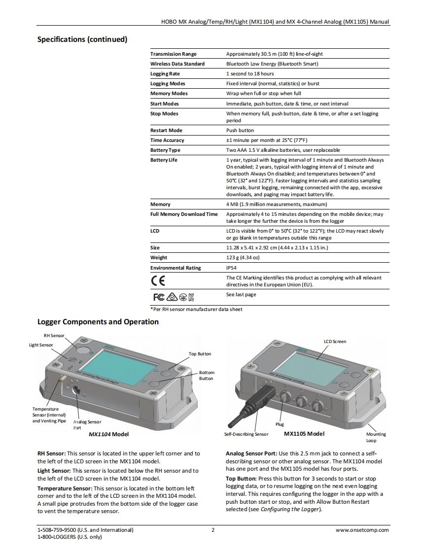 HOBO MX Analog/Temp/RH/Light (MX1104)andMX 4-Channel Analog (MX1105)Data Logger ManualHOBOData LoggersThe HOBO MX Analog/Temp/RH/Light (MX1104)and HOBO MX 4-Channel Analog(MX1105)data loggers measure and transmit data wirelessly from indoor environments to a mobile4825device or computer using BluetoothLow Energy technology.The MX1104 model hasintegrated temperature,relative humidity(RH),and light intensity sensors and one analog inputRNPwhile the MX1105 model has four analog inputs.Both models support a wide variety ofexternal sensors(sold separately),including self-describing temperature,split-core AC currenttransformer,4-20 mA input,and DC voltage input sensors.The self-describing sensors areMX1105 Model Showndesigned with integrated strain relief for a secure connection to the loggers and areautomatically detected by the HOBOconnect app for easy setup.Usingthe app,you canconfigure the loggers,read out and view data,and export the data for further analysis.Theloggers can calculate minimum,maximum,average,and standard deviation statistics and canalso be configured to trip audible or visual alarms at thresholds you specify.In addition,bothloggers support burst logging in which data is logged at a different interval when sensorreadings are above or below certain limits.These compact loggers also have built-in LCDHOBO MX1104 andscreens to display current sensor readings,logging status,battery use,memory consumption,and more.MX1105 Data LoggersModels:Specifications.Analog/Temp/RH/LightTemperature Sensor(MX1104)(MX1104)·4-Channel AnalogRange-20°to70C(4°to158*F(MX1105)Accuracy±0.20°Cfrom0°to50C(t0.36*F from32to122F月Included Items:Resolution0.002Cat25℃(0.004Fat77F)·Tie wrapsDrift<0.1*C (0.18*F)per year·Two AAA1.5 V alkalinebatteries(installed)RH Sensor*(MX1104)0%to100%at-20°to70°C(-4°to158Fh:epo5 ure to conditionsRequired Items:Rangeabove 95%may temporarily increase the maximum RH sensor error。HOBOconnect appby an additional 1%·Mobile device withAccuracy2.5%from 10%to 90%(typical)to a maximum of 3.5%includingBluetooth and iOs,hysteresis at 25'C(77F);below 10%and above 90%5%typicaliPados,or AndroidM,or aWindows computer with aResolution0.01%native BLE adapter orDrift<1%per year typicalsupported BLE dongleResponse Time (MX1104)Temperature11 minutes in air moving 1 m/s(2.2 mph)RH30 seconds to 90%in airflow of 1 m/s (2.2 mph)Light Sensor(MX1104)Range0to167,731ux(15,582lum/ftAccuracy10%typical for direct sunlight (see Light Measurement on page 4 formore details)Logger withSD-MA-420 orSD-VOLT-2.5SD-VOLT-05SD-VOLT-10SD-VOLT-24Cable TypeCABLE-4-or CABLE-2.5-or CABLE-or CABLE-or CABLE-20mASTEREOADAP5ADAP10ADAP24Measurement0 to 20.1 mA0 to 2.5V0 to5.0VO to 10 V0to24VRangeAccuracy±0.001mA0.1mW0.2mW±0.4mW1.0mW0.2%of±0.1%of0.3%of±0.3%of0.3%ofreadingreadingreadingreadingreadingResolution0.3μA40μV80μV160μW384μVLoggerOperating Range-20°to70℃【4to158F)Radio Power1mW(0 dBm)23968-G
