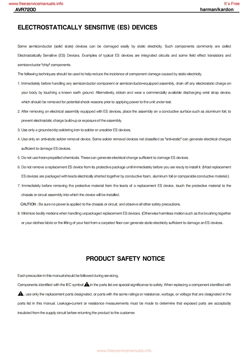 www.freeservicemanuals.infoIt's Freeharman/kardonAVR7200AM DOLBY DIGITAL RECEIVERSERVICE MANUALharman/kardon AVR 7200DV D/CORx:LOGIC CH CoooCONTENTSESD WARNING..EXPLODED VIEW PARTS LIST............19LEAKAGETESTING.............3BLOCK DIAGRAM...22BASIC SPECIFICATIONS.....….4DC OFFSET/IDLE CURRENT ADJ..........23FRONT PANEL CONTROLS.5BULLETIN HK2003-04...............INFORMATION DISPLAY................TECH TIP HKTT2003-01........25REAR PANEL CONNECTIONS...............8ELECTRICAL PARTS LIST..................26REMOTE CONTROL FUNCTIONS..........11PCB DRAWINGS...................74INSTALLATION/CONNECTIONS.......14SEMICONDUCTOR PINOUTS.99TROUBLESHOOTING GUIDE.................17SCHEMATICS.......................158PROCESSOR RESET..........17WIRING DIAGRAM.183UNIT EXPLODED VIEW...............18PACKAGING PARTS LIST.................184haman/kardon,Inc.250 Crossways Park Dr.Woodbury,New York 11797Rev17/2005ww.freeservicemanuals.info