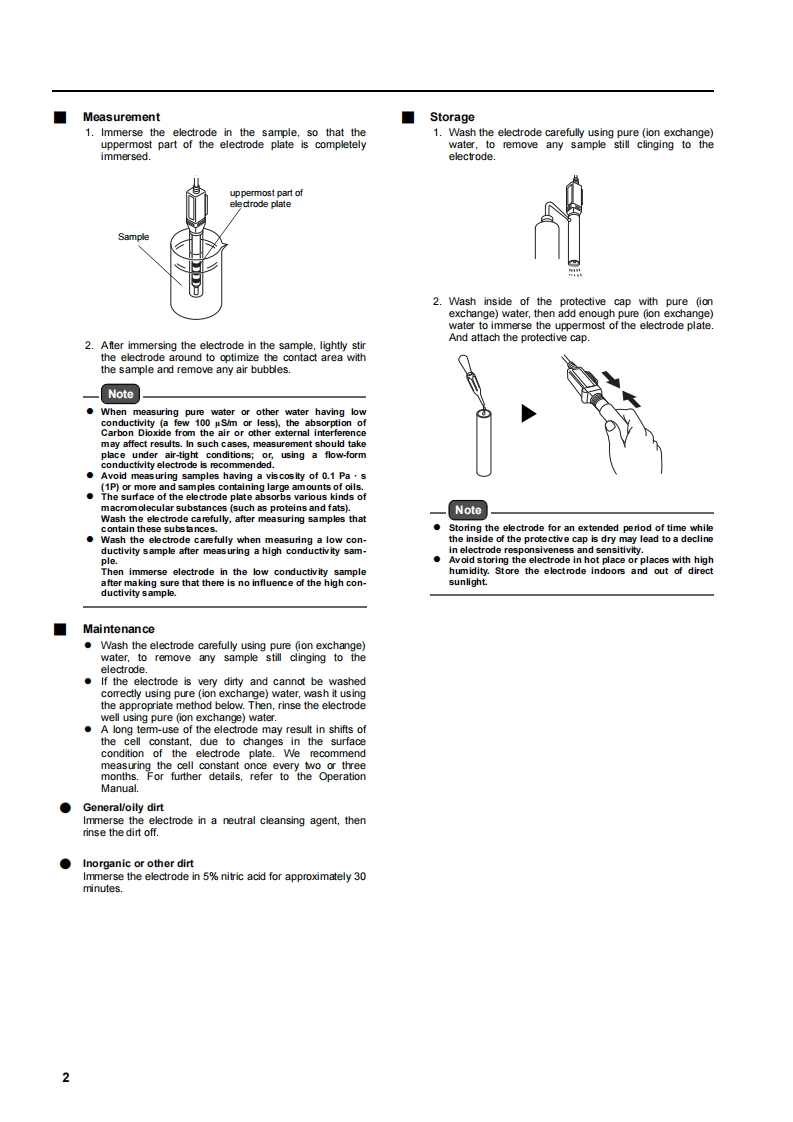 ENVIRONMENTAL EXPRESSoaktonC0DE:M003858-3200839730-GZ0000590186December,2019Conductivity electrode(35660-58)Instruction ManualThank you for purchasing the Oakton electrode.Read thisUsable temp.rangeOC to 80Cmanual carefully before using the electrode.Storage temp.rangeO'C to 50CConformable standards日ectrode materialTitanium-platinum blackThis equipment conforms to the following standards:Wetted part materialsPPS,PSF and fitaniumROHS:9.Monitoring and control instrumentsElectrode length150 mm (ind.cap)Max.height of electrodePlate53 mm (position from electrode tip)Authorised representative in EUExt.diam.of wetted part16 mmCole-Pammer UK9 Orion Court.Ambuscade RoadLead length1mColmworth Business ParkSt NeotsPreparationsCambridgeshirePE198YX,United KingdomConnecting to meterPhone:+44-0)1480-2722791.Insert the electrode connector into the connector portFax:+44-0)1480-212111sleeve on the meter,after aligning with the pin.Do notinsert the connector unless itis aligned properly with theCautions during handlingconnector port.Do not allow the electrode to come in contact with any2.Press the electrode connector into the connector port onhard surface.the meter,while turning the connector to the right.If the electrode pole plate is dry.immerse the electrode3.Slide the connector cover over the connector.Thenin pure (ion exchange)water for at least one hour,priorpush the cover in straight until it comes in light contactto use.with the meter case..The electrode connector requires high insulation.Do notDo not turn the cover.allow the connector to be in contact with water or dirty4.Insert the temperature connector into the jack on thehands.meter.Insert the connector fimmly,until the O-ring on theDo not rub the electrode plate with a brush or polish itconnector can no longer be seen.with a polishing agent..The water-resistant construction of meters can be usedin combination with this electrode to provide water-①resistant construction (conforming to IP-67).Whenmeasuring,do not immerse the cap,the lead or theconnector in the sample.Packaged contentsNameQ'tySetting cell constantThe cell constant for this electrode is displayed on the日ectrode1 pcelectrode cap.Enter the cell constant (shown as 0.954 x 100,in thisOperation Manual1 copyexample)of the electrode,by following the instructions in theOperation Manual for the meter.Specifications and names of parts.Names of partsExample:35660-58 LOT.0.954x100m日ectrodeConnector coverconnector●Preparing electrodeEither wash the electrode plate using a bottle that containspure (ion exchange)water,or immerse the electrode in a中mbeaker containing pure (ion exchange)water and lift theTemp.connector (T electrode)electrode up and down a few times to rinse it,then wipe itdry using filter or tissue paper.Protecfive capBlectrode plateCap●SpecificationsModel35660-58Cell constant100 m (Former units:1 cm*)Measurement range0.1 mS/m to 10 S/m (Former units:1 uS/cm to100 mS/cm)Oakton InstrumentsFor any questions regarding this product,please con