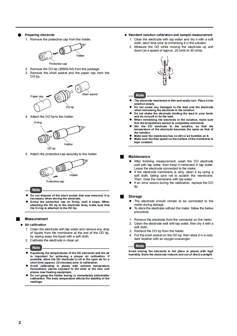 ENVIRONMENTAL EXPRESSoaktonC0DE:M003859-3200839731-GZ0000590188December,2019D0 Electrode(35660-60/35660-62)Instruction Manual.DO is an abbreviation of Dissolved Oxygen.■Specifications and names of parts■Conformable standards●Names of partsThis equipment conforms to the following standards:Electrode connectorR“s:N5:Connector cover9.Monitoring and control instrumentsTemp.connectorAuthorised representative in EU(T electrode)Cole-Pammer UK9 Orion Court,Ambuscade RoadHolderColmworth Business ParkProtectiveSt NeotsCambridgeshireO-ringPE19 8YX,United KingdomPhone:+44-(0)1480-272279Temp.sensorFaX:+44-(0)1480212111CapCautions during handlingACAUTION●SpecificationsChemical solutionModel35660-60,35660-62Highly concentrated potassium hydroxide (KOH)is used in theintemal solution of the electrode.Measurement methodMembrane galvanic cellIf the intemal solution in the electrode comes in contact with yourhands or skin,wash immediately with water.If the intemal solutionMeasurement range0 to 20 mg/Lcomes in contact with your eyes,ush immedialy with largeTemperature range0to50℃amounts of water and seek treatment by a physician.Holder:PC/ABSWetted materialsDO tip PPS,FEPDo not allow the electrode to be in contact with any hardProtedtive cap SCS-14surface.日ectrode sre030×165mmAn extremely thin membrane is stretched across the DOtip and the DO responsive part.Do not allow theead cable length2m35660-60membrane to come in contact with any hard surface and5m(35660-62do not exert undue force on the diaphragm.When attaching the DO tip to the electrode body.make■Preparationssure that the O-ring is attached.Attach the Do tipsecurely to the electrode body.●Connecting to meter.The electrode connector requires a high degree ofinsulation.1.Insert the electrode connector into the connector portsleeve on the meter,after aligning with the pin.Do notDo not allow the connector to be in contact with water orinsert the connector unless itis aligned properly with thedirty hands.connector port.DO tips that are no longer usable should be disposed ofas industrial waste.2.Press the electrode connector into the connector port on.The water-resistant construction of meters can be usedthe meter,while turning the connector to the right.in construction (confomming to IP-67).When measuring.3.Slide the connector cover over the connector.Then,do not immerse the cap,the lead or connector in thepush the cover in straight until it comes in light contactwith the meter case.sample.Do not turn the cover.Packaged contents4.Insert the temperature connector into the jack on themeter.Insert the connector fimmly,until the O-ring on theNameQ'tyconnector can no longer be seenHolder1 pc.D0fp(3566064)1 pc.①Instruction Manual1copyOakton InstrumentsFor any questions regarding this product,please contact your local agency.625 E.Bunker Ct.Vernon Hills,IL.60061.USAor inguire from the following websiteE-mail:info@4oakton.comhttp://www.4oakton.com/Phone number:(1)888-462-5866