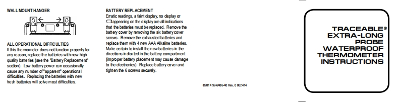 SPECIRICATIONS2.Press the bution to turn he unit onPROBE USEDISPLAY MESSAGESRange:14032300F/-10.03110.0℃3.Insert the probe into the material to beThe probe is suppled with a hoder and ferrel TheE02 Indicates that the temperature beingResolu tion:0.1measured and read the display.ferrel maybe sigh tened so that whle using wit themeasured s below he measurementDisplay Update Rate:10seon出4Press the Cbution to tum he unit off.Toholder the probe maybe set at he desired deph.range of the thermometer or that theconserve batery lte,always tum the unit offprobe andlor cable has been damaged.whe面not in use.The probe and cable are wa terproot;however,forOPERATIONexdended measurement periods,do not leave theE03 Indicates that the temperature being1.Attach he probe and seare he comedionSELECTING'F OR Cprobe hande and cable submersed.Uilse theby tightening.The comedorand plug aremeasured is above the measurementPress the Cbution to tum the unit off.holder and ferrel for extended measurement.keyed.Make oertain that the plug is insered1.range of the thermometer or that he2.Press and hdd the bution for 8 seconds.correcty.do not insert he plug incorrectyprobe andlor cable has been damaged.3.and force t.Continue to press the bution when thedsplay shows a reading.The dsplay willE3 1 Indicates that the electonics have beenelemate between showing the tempera turedamaged.n午ndC4Release the bution once the desiredmeasurement unit is dsplayed.