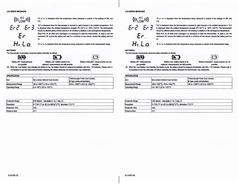 ⑦★u时Lsn①La①0MAX 1308H的然I30阳Defaul Scroon)Defauit ScreonSimply aim theimply &m thee measure tan的时he me8s世eta9lwith Lons andaress Meas.keyress Meas.key】o display th神paue.ThtD5nEe5l体径1 Please ma8ue8a四3is纳n the feld of viewemperature.The Distance:Spot is 12:1.Plaase make sure the targel are is within the fold of view.FUNCTIONPress Mode key for scrolling more display functlon as follows.FUNCTIONPress Mode key)for scrolling more display function as followsEHere wil show the emissivty data.(The dofaut:cmisslvty is 0.95.)Here wil show the emissity data.(The default emisshty is 0.96.)ess Mode key )hen press Up key (or Down key (to set the emissivity,then pess Mode key()Eress Mode key,then press Up hey(升oDa■y(月o set the emi4hw.hen pr6 Mode key可o confirm t The emissivty can be changed from 0.10 (10E)to 1(100E.o confrm t.The em8山cne立ngod fom0.10gb1l0硼Press Mode hey()for the Madmum (MAX),Minimum (NIN)Ditferent between MAX and MIM (DIF)andPress Mode key (for the Maximum (MAL Hinimem (MIN).Different between MAX and MIN (DIF)andAg0W间msds.During the measurement the special modes reading用be displayed besi海hewerage (AVG明modes.Durin时th特measurement,the speck划modes reading wi桶be displayed beside thenode icon.Tmo角cen.HALPHe林g动0owm断U到灯bh8 he High Nlarm0HL)or Lo Alarm [L,hen pre努e33.HALP8s特师ky切Down key (key0村g#eHl的sm0)or Lo Nlarm4.6nre努e33LALrC到与fm For essmplec价te redin时2闭g℃(L27℃.eLew io0 fash and you wil h帖aLAL图到的63 nfim t For6 mle:When the925.9℃cL27℃,时oicon wilash8 nd you wihe8a beep soundConnoct the hemmoooupie with Themocouple socknt (and put the probe inlon the tangot he themmomeler willConnect the themocouple wih Themmooouple socket()and put the prote inon the tarpot the themmomeler wilPR3display he tmperalre auomatcally withou prsing any buton To se mnimu rmm data durhgt甘特orobe measure4 plaase hold down the Up k(etD0wmk时]PRBdisplay the temperafure automaficaly without pressing any bution.To soe the minimum or maxmum data durinp8 obe me8 remant.please ho00 own the Up key团)6mDom小"The thermometer wll automascally shut off if lat idlo for mom than 60sec,uniass in PRB moda.(In FRB modo.will shut of if"The tharmomeler wil automaticaly shut off i lot idle for mona than 60soc.uniess in PRB mode.(n PRB moda,it will shut of iflot ide for more han 12 min.trs)oft idle for more than 12 minutes.]Press Up key()or LOCK mode ONOFF.The lock mode is particularly usehl for oontiuousPress Up k写使判gL0 CK mode ON0Ff.The lock mode is particalyus oouIsE,LA复IIN,DIF,AVGmonngof lemoruptomnesn EMAX,MIN,DIF.AVGmonitoring ol tomperatures for up lo 60 minuesPTD3m博3r℃c下Piess Down期(3划℃m午de特Bky这o backiight function ONOFF.yand press Up kay()for backlight fusction ONOFF.In all modase First holdall modes:First hold半on the Neas.k町Oon the Meas.key (and press Down key [for laser tunction CNCFF.and prss Down key()or laser function ONOFF△CAUTION△CAUTION1.WHEN DEVICE B IN USE.DO HOT LOOK DIRECTLY INTO THE LASER BEAM-PERMANENT EYE DANAGE MAY RESULT.1.WHEN DEVICE IS IN USE,DO NOT LOOK DIRECTLY INTO THE LASER B
