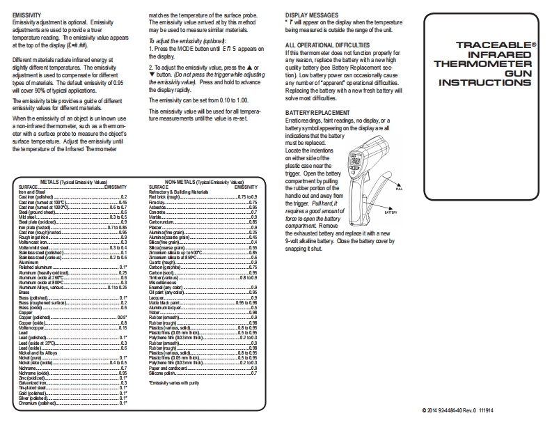 SPECIFICATIOWith the backlght on.each time the triggerR5'Calolated (me weighted}average2 To adus成the temperature由m set point pressRange5线0t018320Fis pressed and held,the LCD display will betemperature)-Press the MODE bution unil R5the A or bumon.(Do not press the tigger whlle-5001010000“Ciluminated by the baoklightappears on the display The time weighted averageagusthg the alam set pointsL Press and hold toResolutior01"Wth laser tangeing on,each time the triggeristemperanure reading is displayed to the right ofadvance the display r印iypressed and held,the laser beam will be emted.R5.This velue isupdated continuouslywhleOPERATIONTo tum the H/Low Alam fundion On/Oftthe tiggeris beng pressed.Press and contnue to hold down the troger toCAUTON:Eye damage may result fom drect1.Locate the SET ALARM ONOFF switch in theexposure to laser ightThe tem"time",in reference to the averagingtake temperature readings.The unit will takehandemode,me ans alltemperabure measurements2 Slide the switch to the desired postontemperabure readings while the triggeris pressedDISTANCE SPOT/RATIOare averaged together from the frst press ofand held (SCAN fashing on the display indicatesThere are other factors that may afect measurementthe trigger Example If the temperature wasWith the Alarm function set to ON (indicated bymeasurements are being taken).acaracy The target must completely fll the spot72for one minute,then 20*for 1/2 second,noHl and LOW appearing on the display)whileAfter the trigger is released,the last temperauredameer seen by the ntrared sensor otherwisesignificant change in average temperanure wouldtaking temperature measurements an alam willmeasured will be displayed for approximately 8readings wilbe nfuenced by the surfacebe displayedsound when the temperature measured is above orseconds,the display will then tum off automaicallysuounding thetarget The raioof the distance tobelow the Hgh and Low alamm set points that haveHRL*(High TemperatureAlam)-Press theHOLD will appearon the display when the triggerthe sizeof the spot being measured is 50:1.Forbeen entered.If the temperaure is above the HighMODE bumon unti HRL appears on the displayhasbeen released to ndicate that the unit is noexample,an object's dameter of 100mm can beAlam set point (HI will fash on the display.IfThe high temperaure alarm velue that has beenlongertaking temperaure measurements.measured fom 5000mmthe temperature is below the Low Alarm set pontset is dsplayed to the let of HRL (See High/L0W)wlfa动n the disp白yLow Alarms secton)SWITCH LOCATIONSVALUES RECORDEDThe alam will sound regardless of the DisplayThe following switches are located in the handerWith each press of the trigger,five values are*LR L'(Low Temperature Alarm)-Press theMode if the temperature measured is above or℃℉recordedMODE bumion unti LR L appears on the dsplaybelow the Hgh and Low alarm set points that haveLOCK ONAOFF1.fRX-Hghest temperature measuredThe low temperature alarm value that has been setbeen en tered.SETALARM ONO