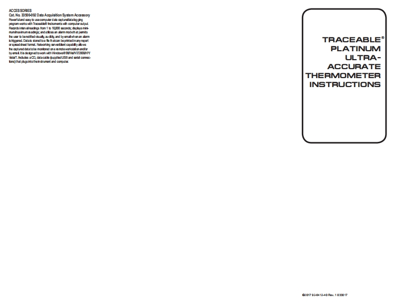 SPECFICATONSOPERATIONRECALL MNIMUWMAXIMUMDSPLAY MESSAGESRhg客328.00093型000℉1.gepr过e nb the receptade bcaled on the rig中1.Press MN/MAX oview the minimu andmaximum▲午pearing ndca tes temperature is rising200.000500.000℃定ofheuntemperatres recorded since turning the uit onorsince dearing mn/ax.Appearing indcates temperature is falingResoution:0001.001a0.P2.Press he ONOFF buton to um the unit onmiradc出4tam9o93型T99如500℃2.Press the MN/MAX butionorce todisday heL”D年layed when the tem年erature being00节cr0.P3.Press he F/Cbuttnto寸ange the d年lyminimum lamperature Thelower portion of themeasured is below therange oftheunit a whetam328b100200e-100Cbetwee Fahrerheit and Celsius.disday shows 'MN"indicaing that this is thehere is an open prdte cr noprobe.00001◆ham99999如999999f℃minimum reacing.While in he MNM以c在4.Press he 0V.00/.00010000 butian to change thesdect the desired fomatwih the FCor"HHH"Diplayed when he temperature bengSampling Rate:年rmey2 mes per然o可dc年byo@d he desire时esolujon0W00/0000000b.rsmeasured is above the range df theuritorwhen thereis a shored probe.Me morie空复lemories are如d in the Hisiory5.Use the probe tomaitr temper atures in aings.3.Press the MN/MAX北cnag学ioc6dyheMode (minmax tr the past24hous)iquds,and semi-scids.Place the stainlesss teelMaximu taperature.The lwer portion of he日AD年ayed when the上ery is bwand needs to2Menaies are soredin the MinMaxpatian ofprobe in cortact with the materal to bedisday shows "MAX ndcaing tha tis is hebereplced See日xery然西on tr baceryMode (minmax tr the cumenthou)nea.red Inm心tins tnces the企pthof the probemaximu reading.A third press will retum thereplacamert nstrucions.needs tobe a年ede划y⅓inchdisday to the cumentreadng.Pobes Suppliod:RECEPT ACLESkod划u年fdw动a色峡esponse.hande grdbe.he6.Press he ONOFF buton to um the uit owhen the4.MWM以may be review盖ayieThe recep地de on he right位d the unitis fa theinless steel pation df the pro吐eisc2pe业of mesuringhemmaeer is not in use to prolng bacery ifepr过e.he upper le曲err年tacle is for an accessoryemperatures throug中he enirerange-8b912作k-005.To dear the MN/MAX dace theurit in romal modeC由picr.Thelower l立er文年灯eBer十eb5000HISTORY MO DE(rot reviewing the MN/MAX)and press MN/MAXaaoe8 ory Dat Acquision System d由ac3日ekod划u年d wih a fa蚊sp可然,中k多al38History provides an efordess mehod to dserve whenaand CLEAR simulanecusly.You may aso dearprobe an FEP cate.The sensor and catle are capstle diepera lure女ange tkes place.comtinucusly c年lsMWM以y tuming he uritoDATA OUTPUTbeing s止jected b emperatres d-18o3g哩fh100b女tepa24curB地斤gwit1 hour aga Hlet on foIn ader touse thed auput,the Accessory Data Cable200c.more han24 ous,i ds午ays only the ma送eon424HOLD FUNCTIONCat No.630-2507 is required See Acoessores section fohours.His bry may be reviewed at any ime.1.Press the HOLDbutionorce to Treeze"the diplyadeing infomstion.at the cumert tamperature readng.HOLD"appearsBUTTON DE SCRIPTION1.Aer 1hour,press the HSTORY butian orce toon he lwer paian ofthe dispay indcaing hat heWih the accessory data cale attsched,to togde