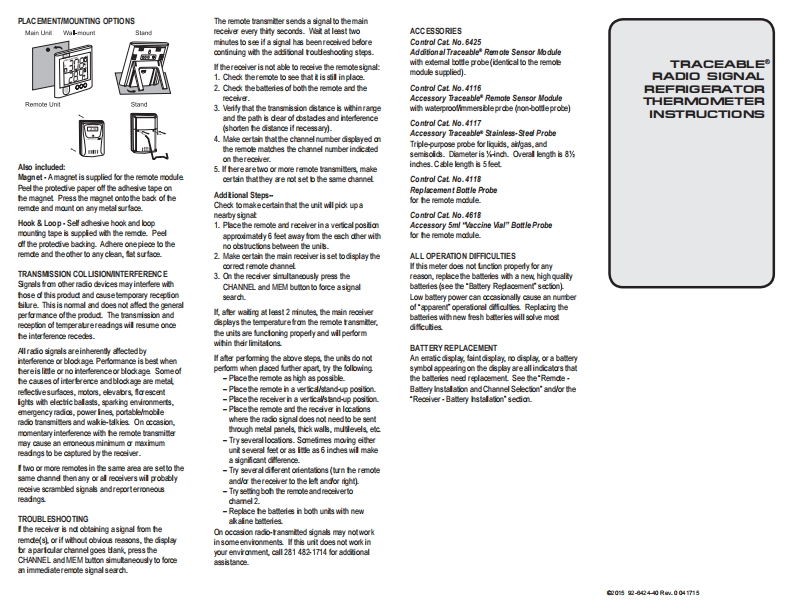 SPECFICATIONSRECEIVER DISPLAYCLEARING THE MIN/MAX MEMORYReceiver一inretigerators and freezers.The solution filed baeThereceiver has a bult in intemal (ambie)To dear the MNMMAXmemory.press he CLEARRng半-14201580℉/990700"Csimulates the temperatre d other stored iquids Theemperalure sensor used的色oley the ambientbutan,all segments of the幽day wil appeer行2ResoluSon:01"bote probe is flled witha nontoxic glyed solution thattemperabure.The arbient temperabure is shown onseconds.Ram6抽一is GRAS (Generally RecognizedAs Sale)by the FDAthe botom portion d the display.Ambient range220b1580下/30.0b700℃Food and Drug Administration)eiminating concemsTheremote readings,comresponding remote channdALARMS (REMOTE MODULE READINGS]Probe range:80b1580℉/0.0b700℃ebou inddertal contad with lood or drinking waer.and temperabure trend are shown an the top portionRemde module alermlimits maybe se in 1Resolution:01Pao and a magelicst帅are provide划o mountdte色y-ncrements Remde module alermlimits are setthe botle to the inside of a retigeralor/reezer.(Doindependent of each other.RF transmission-not imerse botle probes in liguid).Press the CHANNEL buton to switch fomoneith thealam velu出stFrequency:433M也remole chennel to another.Range:Upto 100 feet(30meters)Boh the remole module and botle probe may be.The receiver wil sound an alam when theplacedinside the rerigerator or the bote probe mayThe lemperalure trend indicslor shows the trendofR磁EEvrery 30 secondsempersre mea的ur6dis0.sid块the alarm imits thaRemotes:po3(1 remole inclde间be plsoed inside the retigeralon/teezer and theresdngs at the remde.There are three possblehave beenset (equal to or lower han the low alarmCompliance:This produd complies withremole may belocaled outside of the refigeralonFen出a wil be disdayed9rg.eo时yndset point orequal to or greater than thehigh aammstandards and specificstions dfheezer door.The micro-hinprobe cadle permistaling.烈a周-亚T.FOC and aticle numberrefigeralor/reezer doors to dose onI the temperaure goes aboveor bdow the-The display will swith to he respedive remole334PTΠThe internel (ambient)sersor is localedinside theemperalure meesuring range,the dsplay wil showdhannel with the display fashing.The respectiveHVcase of the remote module isided for monioringHHH a“L"LOindcator(s)will appear to sigritythe sus d theREMOTE.BATTERY INSTALLATION ANDambient air temperalures.Thereception icon shows the signal receiving stausmCHANNEL SELECTIONof the recaver:-The alam will soud regardess ofwhich remotehstall the battedes into the remote(s)befoeOPERATDNdoing so for the recever.Successul Rec平iamOnce beteries areinstalled,theremoles)will startsensa is being displeyed and regardess of theSearch ModeL Ramove the bamery compertmentdisplay mode.transmiting temperalre readings at 30-second2 Select the dhannd nunber using the CHANNELNo SignalirterveBs.Hf the temperabures meesured are ouside the alermslide swil时The receiver willstart searching for signals onoeDISPLAYING 'F OR'C (RECEIVER)imits tha havebeen set for more than