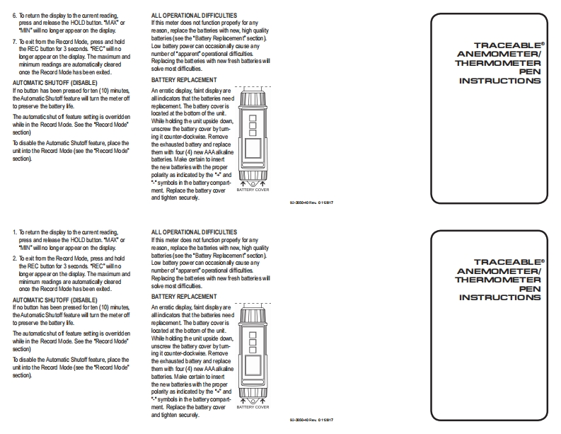 SPECIFICATIONSOPERATIONSELECTING ANEMOMETER UNIT OF MEA-RECORD MODE (Min/Max Memories)Air Flow-Range:0.4 to 30.0 m/S (meters per second)1.Press the POWER buton to turn the meter on.SUREWhile in the Record Mode the maximum and1.Press the POWER bucon to tum the meter onminimum anemometer readings will be recorded.Resolution:0.12 Take the desired measurements.While in the Record Mode,the Automanic ShutoffRange:1.4 to 108.0 Kmh (kilometers per3.Press the POWER button to burn the meteroff2.Press and hold the HOLD bution.After approxi-feature is disabled so that long term monitoringhou)To preserve batterylife,always tumn the meterm尚ree(周seam,the display wll cycmay be pertormedoff when not in usethrough the avalable units of measureResolution:0.1(m/s-Kmh-kndt→thmh→mlah-→m/s-)1.Press the POWER bucon to turn the meter onRange:80.0 to 5910 f/min (deet per mnute)If no bucon is pressed for ten (10)minutes,theOnce the desired unit of measure appears2.To enter the Record Mode,press and releaseResolution:1meter will tum off automancally to preserve batery【elease the HOLD bu0amthe REC bution.REC"will appear on dsplayRange:0.9 to 67.0 mileh (miles per hour)lte(see the"Auomaic Shuotf secion)The unit of measure seledted wil be the default3.To recall the maximum and minimum read-Resolution:0.1SELECTINGFOR℃unit of measure for the anemometer unol dhangedings adhieved since entering the Record ModeRange:08 to 58.3 knot (nauical mles/hour)The following procedure isused to dhange theREC appearing on the display).press andResolution:0.1emperaure display fom℉o“C.or fom℃oHOLD FUNCTIONThe hold fundion allows the readingson the ds-elease the REC buconTe mperature.play to be 'fozen"so that theymaybe recorded.4.The frst press of the REC buton will disolay the1.Press the POWER button to turn the meter onRange:3201220℉/0.0050.0℃1.Press and release the HOLD bution to'reeze"maximum reading achieved since entering theResolution:0.1*2 Press and hold the REC bution.After approxithe display at the current reading."HOLD willRecord Mode (REC MAX"will appear on themately three (3)seconds the temperaure read-Update Rate:1 secondappear at the top of the displaydisdlayling will switch to the op posite unt of measure.2.Once the reading has been recorded,press and5.The second press of the REC buton displaysBattery:4 eachAAA (1.5V)I the meterhad been displaying 'F.t will nowthe minimum reading achieved since enteringdp间“C and vice-versa【elease the HOLD bu0amo【eoum the displato the curent reading.HOLD"will no longerthe Record Mode.(REC MIN"will appear on3.Release the REC buton.appearon the display.he dsp白yThe unit of measure selected will be the defautunit of measure for temperaure und changed.SPECIRICATIONSOPERATIONSELECTING ANEMOMETER UNIT OF MEARECORD MODE (Min/Max Memories)A月Ow-1.Press the POWER button to turn the meteronSUREWhile in the Record Mode,the maximum andRange:0.4 to 30.0 m/S (meters per second)1.Press the POWER bumon to tum the meter onminimum anemometer readings wil be recorded.R