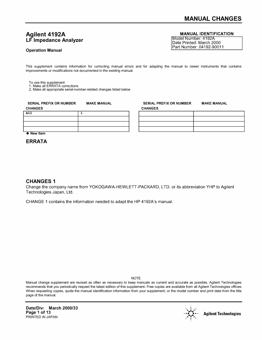 ErrataTitle Document Type:4192A LF Impedance Analyzer Operating and Service ManualManual Part Number:04192-90011Revision Date:March 2000HP References in this ManualThis manual may contain references to HP or Hewlett-Packard.Please note that Hewlett-Packard's former test and measurement,semiconductor products and chemical analysisbusinesses are now part of Agilent Technologies.We have made no changes to thismanual copy.The HP XXXX referred to in this document is now the Agilent XXXXFor example,model number HP8648A is now model number Agilent 8648A.About this ManualWe've added this manual to the Agilent website in an effort to help you support yourproduct.This manual provides the best information we could find.It may be incompleteor contain dated information,and the scan quality may not be ideal.If we find a bettercopy in the future,we will add it to the Agilent website.Support for Your ProductAgilent no longer sells or supports this product.You will find any other availableproduct information on the Agilent Test Measurement website:www.tm.agilent.comSearch for the model number of this product,and the resulting product page will guideyou to any available information.Our service centers may be able to perform calibrationif no repair parts are needed,but no other support from Agilent is available.Agilent Technologies