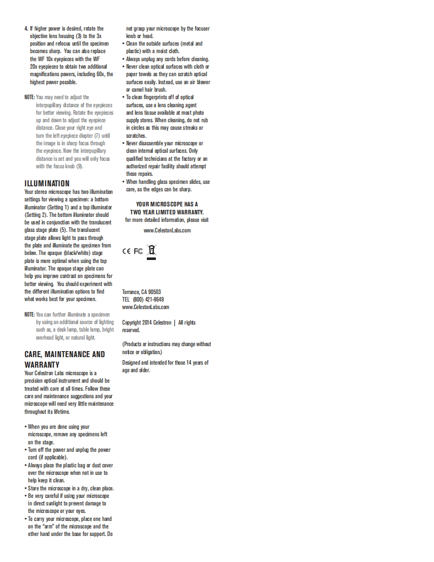 CELESTRONLABSS1060bd#4420CELESTRONLABSEnglish-1 translucent stage plateDIMENSIONS:4.75 in x 7.62 in x 11.50 in8.Insert the plug end of the power cord-1 opaque stage plate(121mmx134mmx292mm)into the proper power source.WEIGHT:2.7 Ibs (1.108 kg)Congratulations on your Celestron LabsPARTSMICROSCOPE OPERATIONmicroscope purchase.Your new Celestron1.EyepiecesMAGNIFICATION TABLEBefore viewing specimens,please readLabs microscope is a precision optical2.HeadOBJECTIVE LENS:1x 3xthese sections thoroughly regardinginstrument made of the highest quality3.Objective Lens HousingWF 10X EYEPIECE:10x 30xfocusing,changing power(magnification)materials to ensure durability and long4.Stage ClipsWF 20X EYEPIECE:20x 60xusing the stage and adjusting illumination.life is desiged togive you aifetime of5.Stage Plateenjoyment with minimal maintenance.6.BaseVIEWING A SPECIMEN7.DiopterSETTING UP YOURStereo microscopes produce a true 3DThe S10-60 microscope provides a low8.Pillar Locking KnobMICROSCOPEimage of the specimen.Your microscopepower range of 10x to 60x.The S10-60 is a9.Focus Knob1.Remove the Styrofoam container fromincudes4 bug specimens to help you getstere,ow-maficiomicroscope ideal10.Top Muminatorthe carton.started.for examining specimens such as coins,11.Power Switch2.Carefully remove the microscope andstamps,rocks,electronics,jewelry,watches12.Bottom lluminator (in base)accessories from container and set them1 Carefully place a specimen in the centerinsects,and other 3D objects.on a table,desk or other flat surface.of the stage plate.SPECIFICATIONS3.Remove bag coverings from microscope.2.Rotate the knurled ring on the objectiveBefore attempting to use your CelestronSTAGE:Stage Plate with clips4.Make sure the head (2)is parallel tolens housing (3)to the 1x position.It isLabs microscope,please read theseHEAD:Binocular with 45 inclinethe base (6).If it is not,then hold thebest to begin viewing a specimen at lowinstructions to familiarize yourself withMAGNIFICATION:10x,20x,30x,60xhead (2)with one hand and loosen thepower,then switch to higher power asthe parts and functions of the microscope.FOCUSER:Coarse focuspillar stand locking knob with the otherneeded.Refer to the microscope diagrams to locateOBJECTIVES:1x,3xtuming it counterclockwise.Then rotate3.Look through the eyepieces andthe parts discussed in the manual.The finalEYEPIECES:WF 10x,WF 20xthe head until it is perpendicular to thegradually tum the focus knob (9)untilsection of the manual provides simple careINTERPUPILLARY DISTANCE:base.the specimen comes into focus.If thereand maintenance tips.2.7in-295in5.Remove eyepieces (1)from plastic bagsis not enough travel in the focuser(55mm-75mm)6.Insert thetwo WF 10x eyepieces into themechanism to reach focus,it may beIN THE BOXILLUMINATOR:eyepiece tubeson the binocuar head (2).necessary to loosen the pillar standMicroscope $10-60Top tungsten and bottom halogen7.If you do not wear eyeglasses,you canlocking knob (8)and raise or lower the-2 sets of wide field eyepi