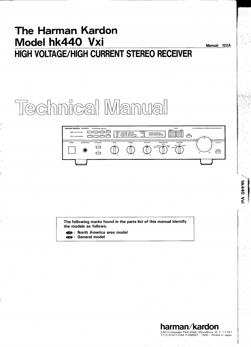 The Harman KardonModel hk440 VxiManual 122AHIGH VOLTAGE/HIGH CURRENT STEREO RECEIVER下echnical Manual密88B,晋巴直吕①①①①hk440 VxiThe following marks found in the parts list of this manual identifythe models as follows.North America area modelGeneral modelharman/kardon