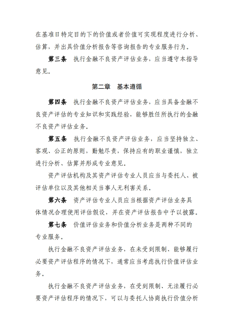 附件金融不良资产评估指导意见第一章总则第一条为规范金融不良资产评估行为,保护资产评估当事人合法权益和公共利益,根据《资产评估基本准则》制定本指导意见。第二条本指导意见所称金融不良资产,是指银行持有的次级、可疑及损失类贷款,金融资产管理公司收购或者接管的金融不良债权,以及其他非银行金融机构持有的不良债权。本指导意见所称金融不良资产评估业务包括资产评估专业人员执行的以金融不良资产处置为目的的价值评估业务(以下简称价值评估业务)和以金融不良资产处置为目的的价值分析业务(以下简称价值分析业务)。价值评估业务是指资产评估机构及其资产评估专业人员遵守法律、行政法规和资产评估准则,根据委托对在评估基准日特定目的下的金融不良资产价值进行评定和估算,并出具评估报告的专业服务行为。价值分析业务是指资产评估机构及其资产评估专业人员根据委托,对无法履行必要资产评估程序的金融不良资产