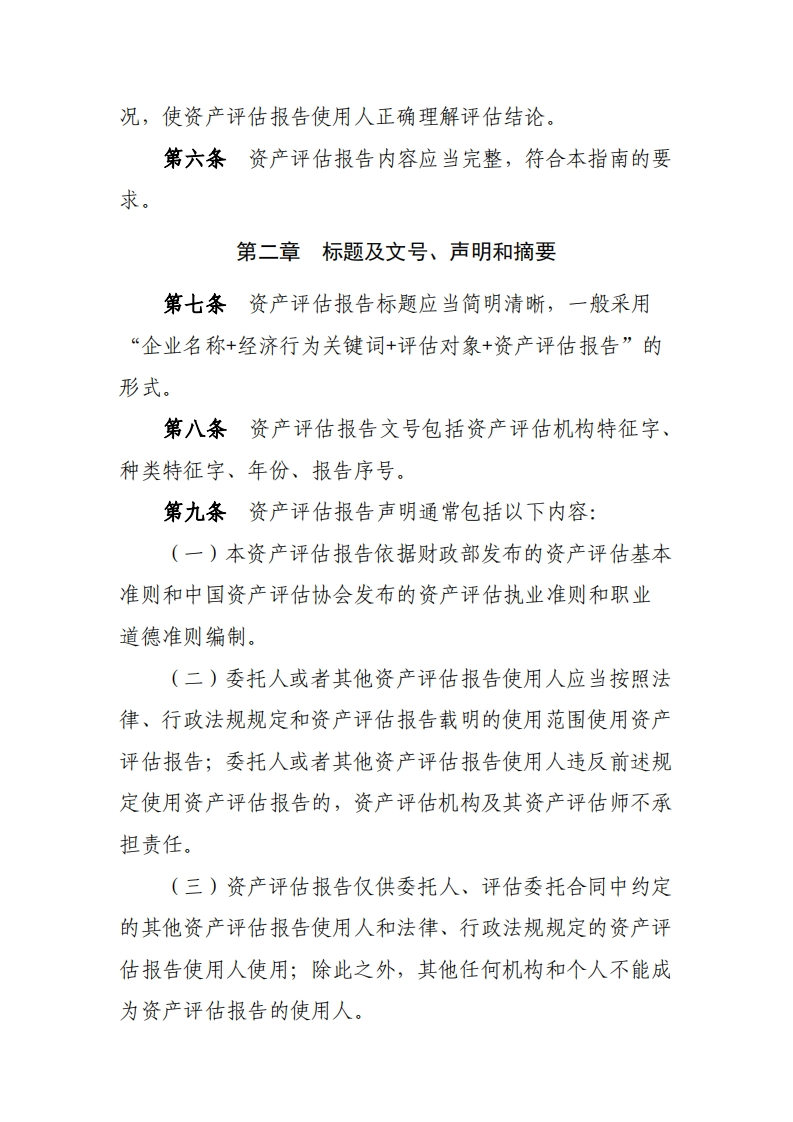 附件金融企业国有资产评估报告指南第一章总则第一条为规范金融企业国有资产评估报告编制和出具行为,保护资产评估当事人合法权益和公共利益,根据金融企业国有资产评估管理有关规定和《资产评估执业准则一一资产评估报告》制定本指南。第二条资产评估机构及其资产评估师根据金融企业国有资产评估管理的有关规定执行资产评估业务,编制和出具金融企业国有资产评估报告,应当遵守本指南。本指南所称金融企业,是指占有国有资产并取得金融业务许可证的企业、金融控股公司以及其他从事金融类业务的企业。第三条本指南所指金融企业国有资产评估报告(以下简称资产评估报告),由标题及文号、目录、声明、摘要、正文、附件、评估明细表和评估说明构成。第四条资产评估机构及其资产评估师应当清晰、准确陈述资产评估报告内容,不得使用误导性的表述。第五条资产评估报告提供的信息,应当使金融企业国有资产监督管理部门和相关机构能够全面了解资产评估情