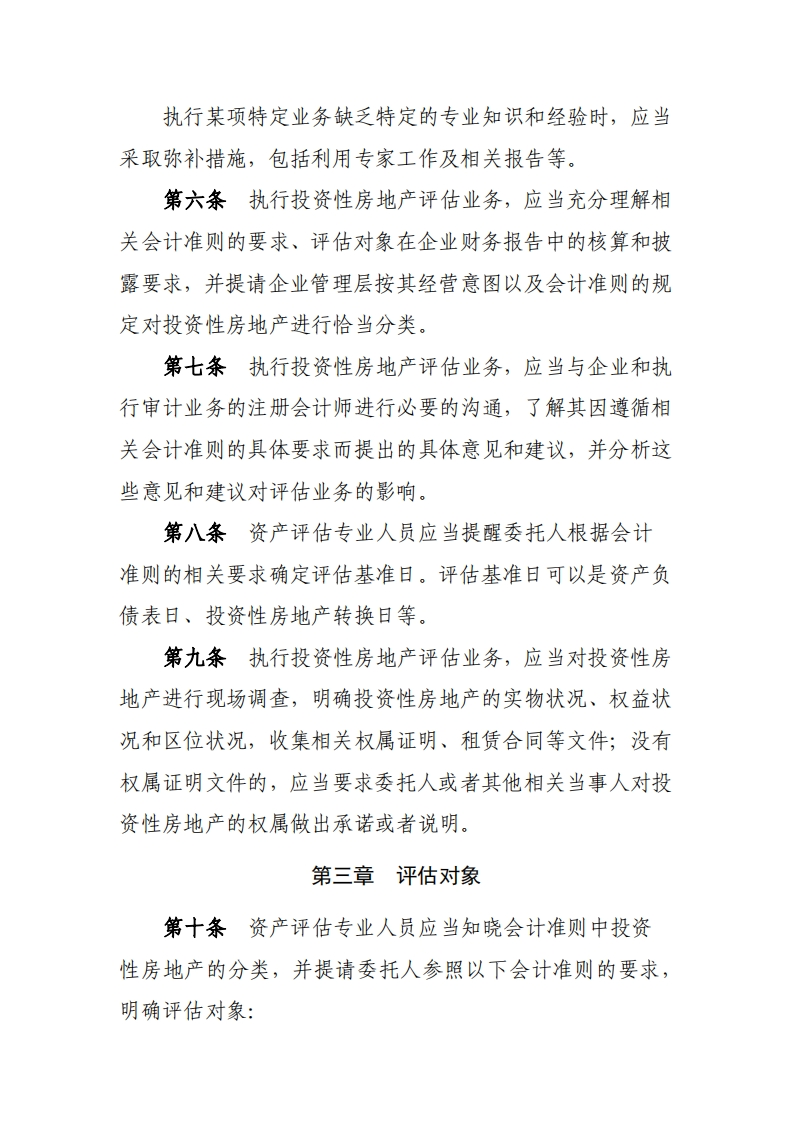 附件投资性房地产评估指导意见第一章总则第一条为规范投资性房地产评估行为,保护资产评估当事人合法权益和公共利益,根据《以财务报告为目的的评估指南》制定本指导意见。第二条本指导意见所称投资性房地产,是指《企业会计准则第3号一一投资性房地产》及其应用指南所称的投资性房地产,即企业为赚取租金或者资本增值,或者两者兼有而持有的房地产。第三条本指导意见所称投资性房地产评估,是指资产评估机构及其资产评估专业人员遵守法律、行政法规和资产评估准则,根据委托对以财务报告为目的所涉及的符合会计准则规定条件的投资性房地产在评估基准日的公允价值进行评定和估算,并出具资产评估报告的专业服务行为。第四条执行投资性房地产评估业务,应当遵守本指导意见。第二章基本遵循第五条执行投资性房地产评估业务,应当具备投资性房地产评估的专业知识和实践经验,能够胜任所执行的投资性房地产评估业务。