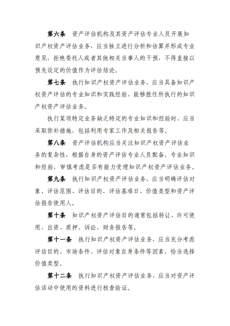 附件知识产权资产评估指南第一章总则第一条为规范知识产权资产评估行为,保护资产评估当事人合法权益和公共利益,根据《资产评估执业准则一一无形资产》制定本指南。第二条本指南所称知识产权资产,是指知识产权权利人拥有或者控制的,能够持续发挥作用并且带来经济利益的知识产权权益。知识产权资产包括专利权、商标专用权、著作权、商业秘密、集成电路布图设计和植物新品种等。第三条本指南所称知识产权资产评估,是指资产评估机构及其资产评估专业人员遵守法律、行政法规和资产评估准则,根据委托对评估基准日特定目的下的知识产权资产价值进行评定和估算,并出具资产评估报告的专业服务行为。第四条执行知识产权资产评估业务,应当遵守本指南。第二章基本遵循第五条资产评估机构及其资产评估专业人员开展知识产权资产评估业务,应当遵守法律、行政法规的规定,坚持独立、客观、公正的原则,诚实守信,勤勉尽责,谨慎从业,遵守职业道德规范,自觉维护职业形象,不得从事损害职业形象的活动。