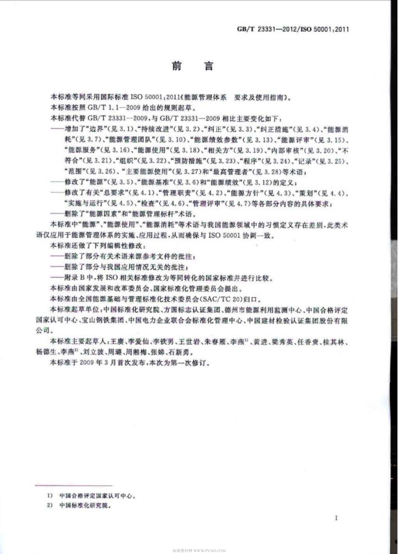 1Cs27.010F01中华人民共和国国家标准GB/T23331-2012/1S050001:2011代替GB/T23331一2009能源管理体系要求Energy management systems-Requirements(IS050001:2011,IDT)2012-12-31发布2013-10-01实施中华人民共和国国家质量监督检验检疫总局中国国家标准化管理委员会发布标准资料网WWW.PV265.COM