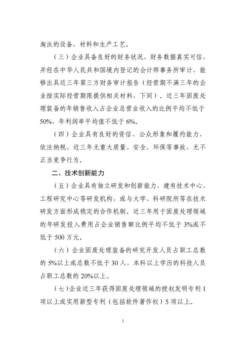 附件环保装备制造业(固废处理装备)规范条件为加快引导环保装备制造业(固废处理装备)高质量发展,促进行业技术创新,提升绿色发展水平,制定本规范条件。本规范条件中的固废处理装备是指能够减少固体废物危害性、充分合理利用固体废物和无害化处置固体废物的装备(不包括危险废物处理装备)。本规范条件适用于已建成投产的固废处理装备制造企业,是鼓励行业技术进步和规范发展的引导性文件,不具有行政审批的前置性和强制性。一、基本要求(一)企业具有独立法人资格,取得企业法人营业执照,符合国家及地方产业政策、土地利用、城乡建设等发展规划,以及相关节能、环保、安全等法律法规和政策要求。(二)企业具备技术研发、产品设计、生产制造、安装调试等相关资质和能力。生产工艺、设备符合国家产业政策要求,不生产国家明令淘汰的产品,不使用国家明令