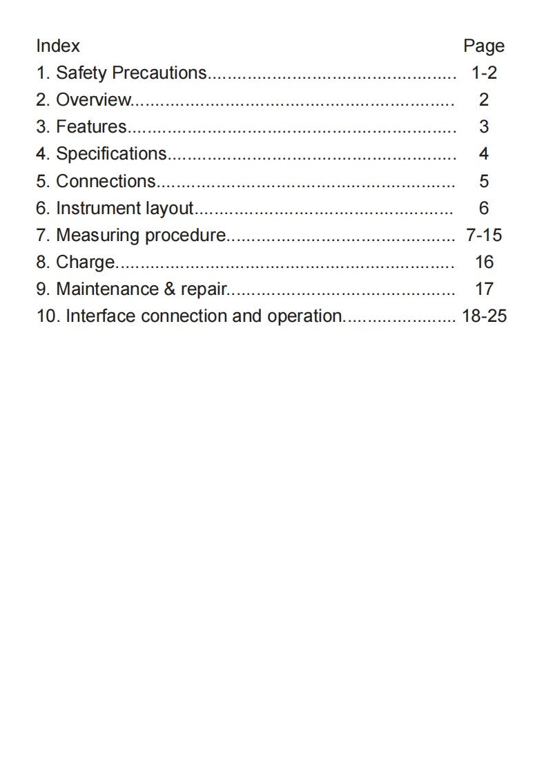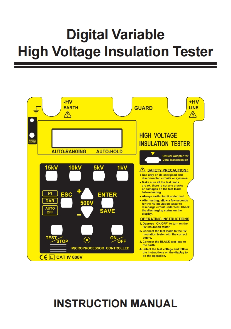 Digital VariableHigh Voltage Insulation Tester-HV+HVEARTHGUARDLINEHIGH VOLTAGEINSULATION TESTERAUTO-RANGINGAUTO-HOLDOptical Adapter forData Transmission15kV10kV5kV1kVSAFETY PRECAUTIONIUse only on de-energised anddisconnected circuits or systems.Make sure all the test leadsare ok,there is not any cracksor damages on the test leadsPI■ESCENTERbefore testing.Always earth circuit under test.DAR500VAfter testing,allow a few secondsfor the HV insulation tester toAUTOdischarge circuit under test.CheckOFFSAVEthe discharging status on thedisplay.OPERATING INSTRUCTIONS1.Depress "ON/OFF"to turn on theHV insulation tester.2.Connect the test leads to the HVinsulation tester with the correctTEST米ONcolors.STOPOFF3.Connect the BLACK test lead tothe earth.MICROPROCESSOR CONTROLLED4.Select the test voltage and followthe instructions on the display toCE▣CATV60OVdo the operation.INSTRUCTION MANUAL