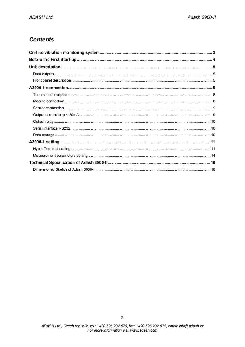 ■Adash■USER MANUALA3900I川Online Monitoring System●●●●●●●●表Adash3900-13.76●mm/sSIGNALctceceeeADASH Ltd.,Czech republic,tel:+420 596 232 670,fax:+420 596 232 671,email:info@adash.czFor more information visit www.adash.com