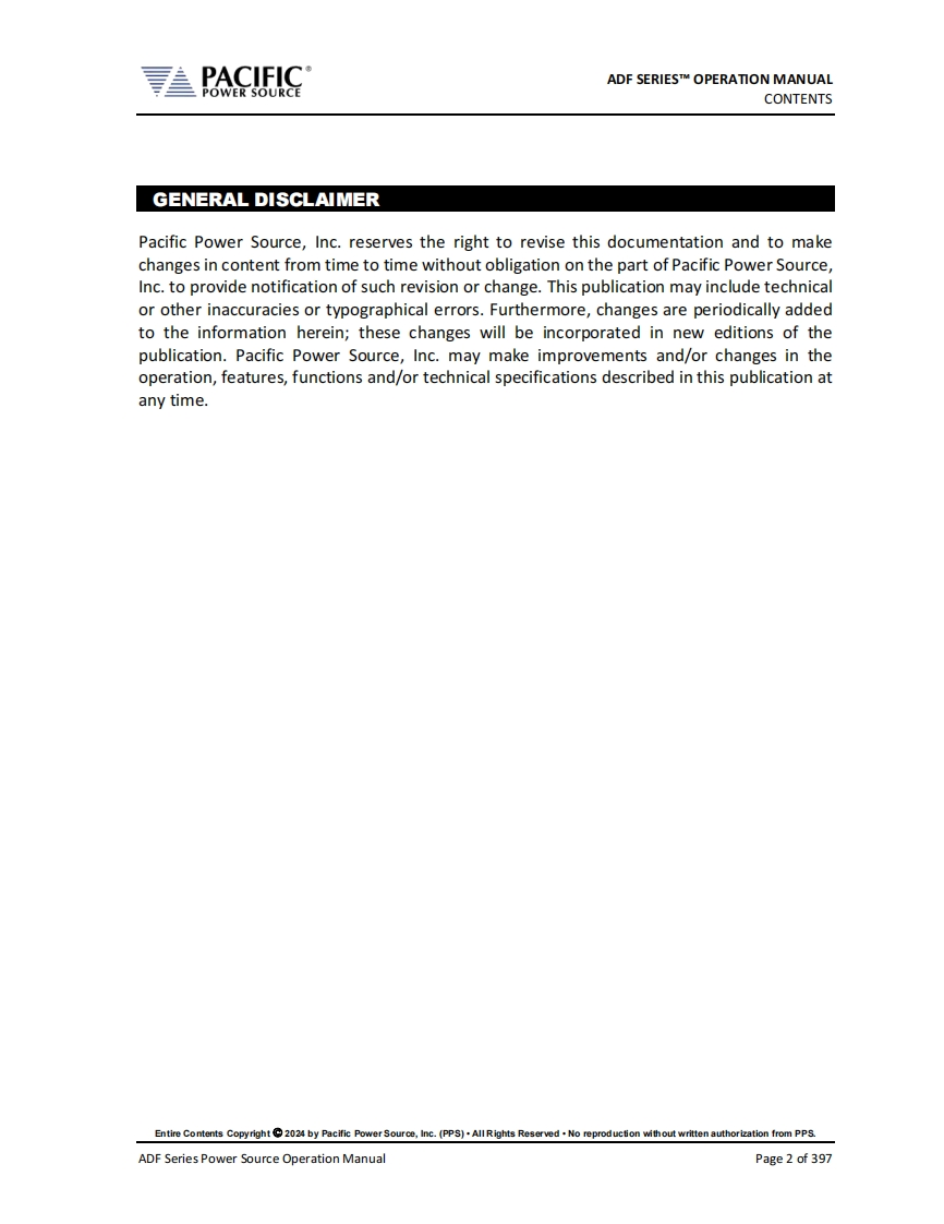 Operation ManualADF SeriesTM-Rev 1.1.7P/N160670-10ADF Series®Programmable AC Power Source3150ADF9冠000潮←=圓网0YAPACIFICSmartSource-5LXILAN eXtensions for instrumentationPACIFIC PACIFIC POWER SOURCEPOWER SOURCEWorldwide Supplier of Precision Programmable PowerCopyright 2024,Pacific Power Source,Inc.(PPS).All Rights Reserved.No reproduction without written authorization from PPS.