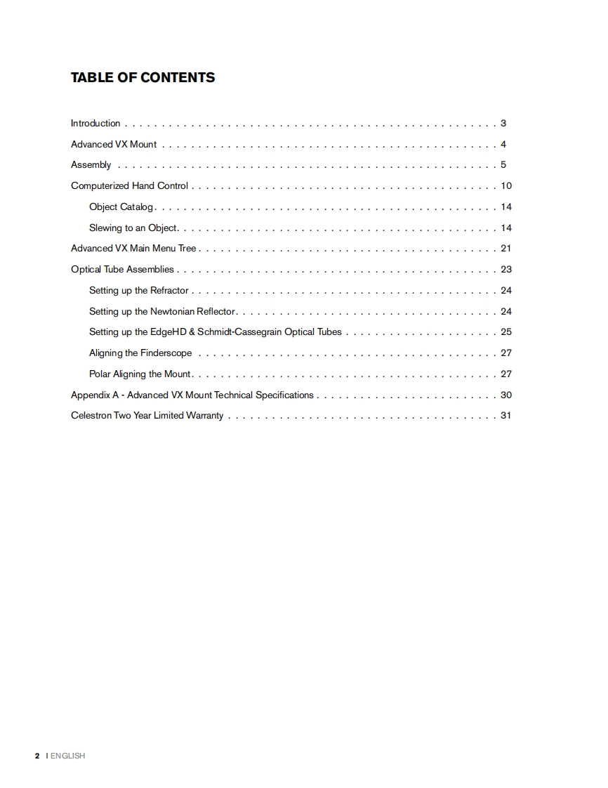 CELESTRON八&XADVANCED VXSERIESINSTRUCTION MANUAL FOR MODELS:#91519-Advanced VX Mount#12079-Advanced VX 6"Schmidt-Cassegrain Telescope#32054-Advanced VX 6"Newtonian Telescope#12026-Advanced VX 8"Schmidt-Cassegrain Telescope#32062-Advanced VX 8"Newtonian Telescope#12046-Advanced VX 9.25"Schmidt-Cassegrain Telescope#22020-Advanced VX 6"Refractor Telescope#12067-Advanced VX 11"Schmidt-Cassegrain Telescope#12025-Advanced VX 5"Schmidt-Cassegrain Telescope#12031-Advanced VX 8"EdgeHD Telescope
