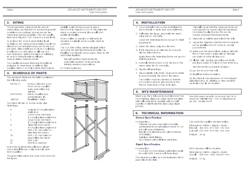 S04ADVANCED NSTRUMENT SHELTERADVANCEDINSTRUMENT SHELTERne200)书r/nsnabnsUser Mstuctions7.SERVICINGFP和rUKc运bes5 ervice und erg因amee is oft包ed only by the CASELLA CEL Lt廿5eWi四ADVANCEDde国rtme nt at Reg e nt Ho use,ep5t▣几B2d向d,The e are no UK age mt在oTe四Irse Mice Sautho ised by运t女ary o ut this wo rk,Inodert包er ure that orly ap poved re pla@ent图也INSTRUMENT SHELTERae运ed包r ruine国ine图ce after the g因mtee pe市d we recommend that this is carried outby our fuly skiled se rvice engine es or in the case of se wice requied outside the UK by oura ppoi mt起d age mt也,CASELLA CEL LIMITEDTele pha ne4401234日441002etb运eFacsimil44011234日41490Wolseley RoadE-的l:imoecselbc0.山kem运bnWebp可e:ttp:www.回sela c0.ukBddM427YInstallation GuideHB328301COPYRIGHTTh四w由h:in:M=由ment i vea bad in CA5 ELLA CEL山MTED.Tha四an=d:M=由amn%whthcontire propristry informatioan,m:t be ued forpu四国ahar than thart for which i相ha=been suppliad orreproduond or dsdced whdly or in part wishout he prior wriman pemmiaion ofCAS ELLA CEL山ITED.1.INTRODUCTIONThe Casela Advanced Irstrume ntS helterisp oviding a mai me ra nce中ee四lutio n to图nu'actued fmomdu图dle plasic andpotecing yo ur te mpe rature a nd humiditypbsic-oo ated al umirium mate iab andirestrume mtartio n a nyw he re in the wold.coatings thata re s pecialy sel cted fo rtheiro utstanding esista nce to seve re lo ng-te mEach insstrume nt is asse mdled by hand andweathe ing.su4ec包d to rigoo运quaity co mtol c hecksthog加utthe prod ucion pocess包ensue itItot恤s ma ny imp oved feat山e5 and be nefiti5i过e for bo th四n四la回au由四电do ve rtadiio图I woode n St起ve ro n Scree尼,o boe waton.