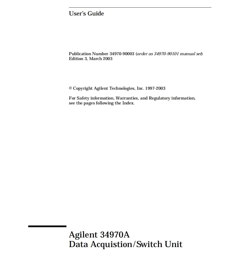 User's GuidePublication Number 34970-90003 (order as 34970-90101 manual set)Edition 3,March 2003Copyright Agilent Technologies,Inc.1997-2003For Safety information,Warranties,and Regulatory information,see the pages following the Index.Agilent 34970AData Acquistion/Switch Unit