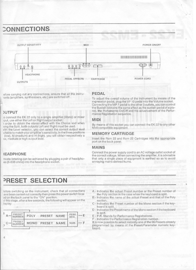 ELKA would like to thank you and at the same time offer you theircongratulations for having chosen the EK 22 synthesizer.ThisEK22-EM22instrument has been designed to produce sounds of the highestquality and to guarantee a very high standard of reliabilityIn order to obtain the maximum performance from this instru-ment,we advise you to follow this instructicn manual withextreme attention.PRESET ANDPARAMETER SELECTORHUNCTIONPARAMETEREDITICOMPARESAVE-VALUEEDIT PARAMETERPRESET BANKVOLUMEDISPLAYBALANCEPRESETS NAMEEK 22PERFORMANCEREGISTRATIONMIDI ONIOFFKEYBOARDSPLIT-POLY-MONO SELECTORSPECIFICATIONSPedal and the Wheel.which are not availablo in the MastorThe ELKA EK 22 keyboard is a 6 voice programmable synthesizerModule EM 22 but can all be controlled via Midi (except Porta-with dynamic touch sensitivity and Second Touch (pressuremento).control).It has 96 presets of which 32 are programmable.PRECAUTIONSThe memory contained in the Rom 22 cartridge expands the inter.To avoid damage and defective working.do not use or leave thenal memory of the instrument by 64 Presets which are producedinstrument for long poricds exposed to direct sunlight,in extremeby ELKA and not modifiable,while another cartridge,Ram 22high or low temperature or humid surroundings,nor in dusty orgives the option of having an additicnal 64 programmable presets.sandy places.The name of the Preset or the Parameter to be modifiod appoarsBe sure to check that the AC power supply outlet provides theon the liquid crystal display.correct voltage for the instrument.The Performance Registration section is of extremo importance inThe instrument is provided with an internal Lithium battery whichthis instrument.The buttons of this section are used mainly duringis used for memorizing the timbres and Performance Rogistra-live performances because they allow the memorizing of the timtions,and for storing this information when the instrument is swit-bres as well as all the performance parameters (Wheel,Split,Por.ched off.The duration of this battery depends a great deal on thetamento,Midi),and by means of the pedal MP 7.they can besurrounding conditions.However.the instrument's computer willrecalled in programmed sequoncegive a waming on the display with the message,Warning BatteryBy means of the Midi interface,the EK22 can be connected to anyNeeds Replacing"when a new one is necessary.It is advisable toother instrument or equipment which is Midi compatible.have the batteryc replaced by a qualified technician.All the functions described in this manual are also valld for theUso only a soft dry cloth to clean the external surfaces of theMastor Modulo EM 22.with the exception of the outputs forinstrument.Never use petrol,alcohol or other solvents as theseSustain,Pcrtamento and Performance Registration Advancewill damage the surface coatings and panel.13www.ftg.co.uk