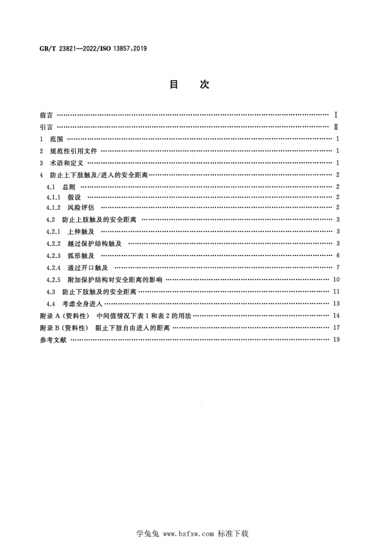 ICs13.110CCS J 09GB中华人民共和国国家标准GB/T23821-2022/IS013857:2019代替GB/T23821一2009机械安全防止上下肢触及危险区的安全距离Safety of machinery-Safety distances to prevent hazard zonesbeing reached by upper and lower limbs(IS013857:2019,IDT)2022-11-08发布2022-11-08实施国家市场监督管理总局国家标准化管理委员会发布学兔兔www.bzfxw.com标准下载