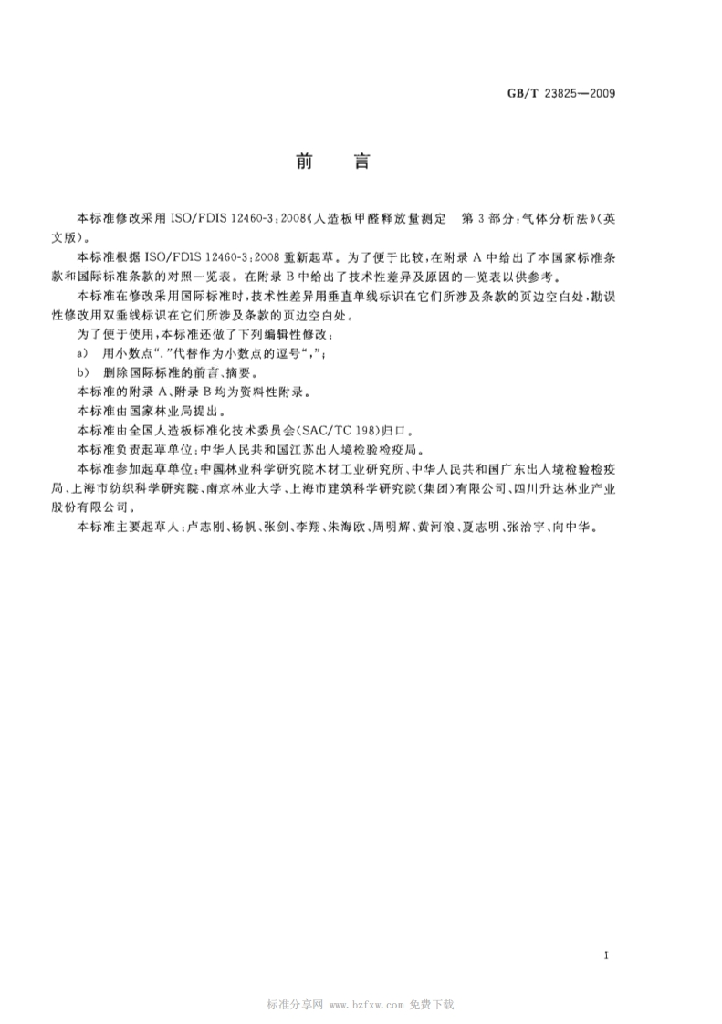 ICs79.060.01B70中华人民共和国国家标准GB/T23825一2009人造板及其制品中甲醛释放量测定气体分析法Wood-based panels-Determination of formaldehyde release-Gas analysis method(ISO/FDIS 12460-3:2008,Wood-based panels-Determinationof formaldehyde release-Part 3:Gas analysis method,MOD)2009-05-12发布2009-11-01实施中华人民共和国国家质量监督检验检疫总局中国国家标准化管理委员会发布