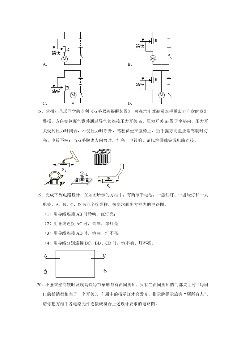 15.在汽车转向灯电路中,要求左转弯时只能左转向灯亮,右转弯时只能右转向灯亮,不能出现在操作转向开关时左、右转向灯同时亮的情况。下列设计中最合理的是()⑧在前⑧8s⑧左前左后⑧古前⑧-⑧-S2右后S2A.右前右后B日交前H区在后7a心首前⑧&7a左前左后b☒-⑧凵bD.右前右后16.高铁轨道中的螺丝会因震动而松动,检修工作艰苦且重要。青少年科技创新大赛的获奖作品(5G高铁轨道螺丝警报器),设计了检测螺丝松动的报警方案。其主要原理是:螺丝(在电路图中用虚线框表示,电阻不计)连接在电路中,当螺丝松动时,它会与下端的导线分离而断开,此时电灯亮起而发出警报。及时提醒工人修理。下列符合题意的电路图是(螺丝丝AB螺L螺丝D17.为了减少碳排放,国家大力推行电动汽车。电动汽车的速度由流经电动机的电流大小控制,当驾驶员向下踩“油门”踏板时,改变接入电路的变阻器阻值,车速变大。下列是该电动汽车的模拟电路,其中符合要求的是()