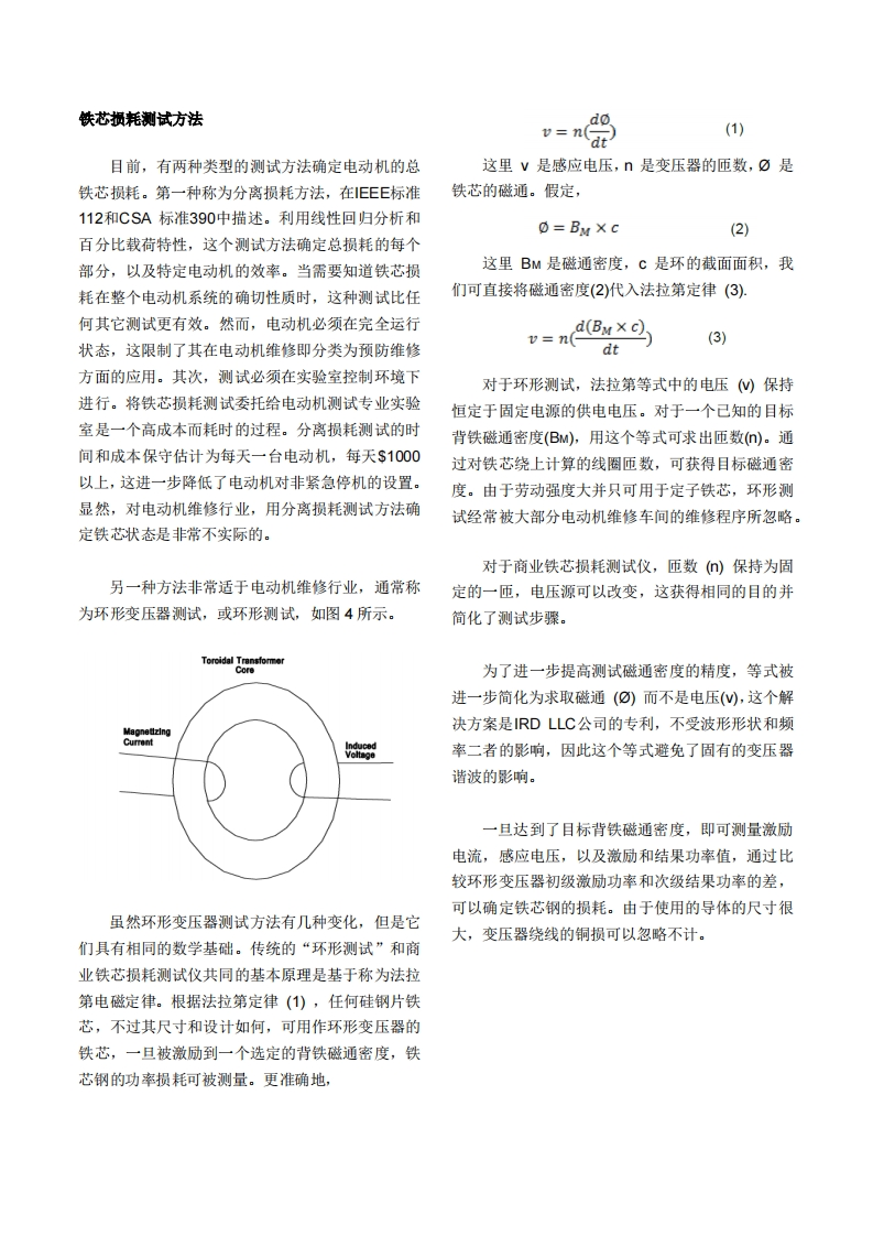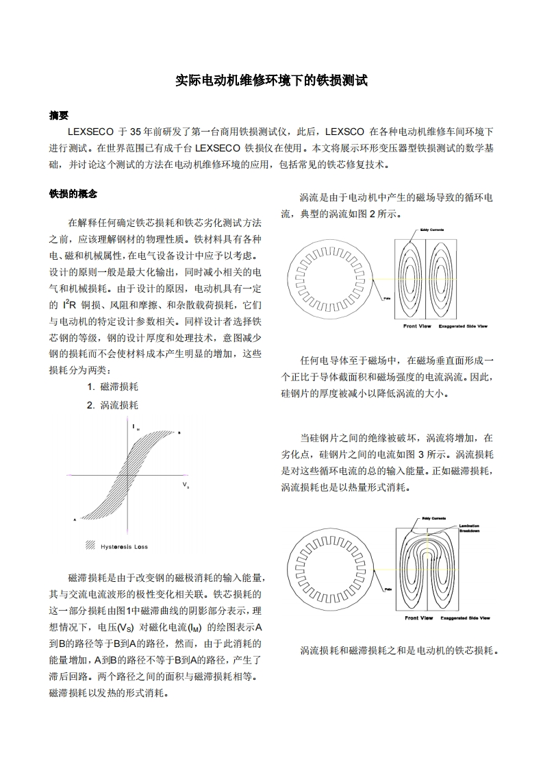 实际电动机维修环境下的铁损测试摘要LEXSECO于35年前研发了第一台商用铁损测试仪,此后,LEXSC0在各种电动机维修车间环境下进行测试。在世界范围已有成千台LEXSECO铁损仪在使用。本文将展示环形变压器型铁损测试的数学基础,并讨论这个测试的方法在电动机维修环境的应用,包括常见的铁芯修复技术。铁损的概念涡流是由于电动机中产生的磁场导致的循环电流,典型的涡流如图2所示。在解释任何确定铁芯损耗和铁芯劣化测试方法之前,应该理解钢材的物理性质。铁材料具有各种电、磁和机械属性,在电气设备设计中应予以考虑。suu设计的原则一般是最大化输出,同时减小相关的电气和机械损耗。由于设计的原因,电动机具有一定的2R铜损、风阻和摩擦、和杂散载荷损耗,它们n几几n几u与电动机的特定设计参数相关。同样设计者选择铁芯钢的等级,钢的设计厚度和处理技术,意图减少钢的损耗而不会使材料成本产生明显的增加,这些任何电导体至于磁场中,在磁场垂直面形成一损耗分为两类:个正比于导体截面积和磁场强度的电流涡流。因此,1.磁滞损耗硅钢片的厚度被减小以降低涡流的大小。2.涡流损耗当硅钢片之间的绝缘被破坏,涡流将增加,在劣化点,硅钢片之间的电流如图3所示。涡流损耗是对这些循环电流的总的输入能量。正如磁滞损耗,涡流损耗也是以热量形式消耗。Hysteresis Lossuuti磁滞损耗是由于改变钢的磁极消耗的输入能量,其与交流电流波形的极性变化相关联。铁芯损耗的2几ZnI2n几这一部分损耗由图1中磁滞曲线的阴影部分表示,理想情况下,电压Ns)对磁化电流(M)的绘图表示A到B的路径等于B到A的路径,然而,由于此消耗的涡流损耗和磁滞损耗之和是电动机的铁芯损耗。能量增加,A到B的路径不等于B到A的路径,产生了滞后回路。两个路径之间的面积与磁滞损耗相等。磁滞损耗以发热的形式消耗。
