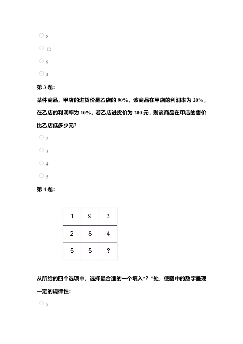 滴滴快的2016校园招聘网上测试题348072@abc3个月前发布关注私信0.29MB20页035滴滴快的2016校园招聘网上测试题此内容为付费资源,请付费后查看¥11¥31黄金会员免费钻石会员免费立即购买您当前未登录!建议登陆后购买,可保存购买订单付费资源 第1页 / 共20页 第2页 / 共20页 试读已结束,还剩18页,您可下载完整版后进行离线阅读 THE END初中教育学习资源小学教育教育学类高中教育高考真题 文本预览 滴滴快的2016校园招聘网上测试题第1题:594A-37-3从所给的四个选项中,选择最合适的一个填入“?”处,使图中的数字呈现一定的规律性:○5○100-2○-8第2题:12153214972416?从所给的四个选项中,选择最合适的一个填入“?”处,使图中的数字呈现一定的规律性: 查看更多 收起部分 喜欢就支持一下吧收藏