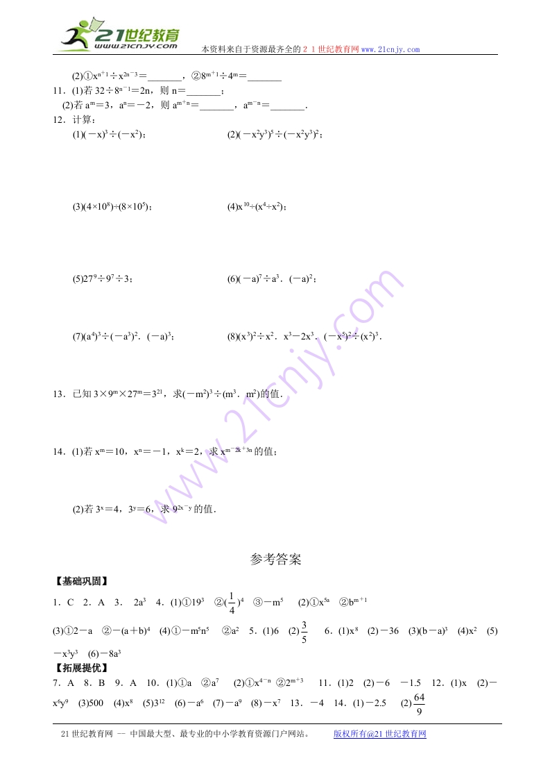 27世纪教育www21cny.com本资料来自于资源最齐全的21世纪教育网mmm.21cnjy.com第1课时同底数幂的除法()【基础巩固】1.下列各式计算正确的是()A.(a+1=a2+1B.a2+a3=a5C.a8-a2=a5D.3a2-2a2=12.am=3,am=2,则amn的值是()A.1.5B.6C.9D.83.化简:6a6÷3a3=.4.0019÷19e=一②(-号÷(-4P=4,③(-m8÷(-m)3=(2)①x%÷x4=,②b2m÷bm1=:(3)①(a-2÷(2-a)5=,②(-a-b)5÷(a+b)=(4)①(-mm)9÷(mn)=,②(a2y÷(-a2)2=6.计算:(1)x10÷x5.x3:(3)(a-b)o÷(b-a)7:(5(-xy)7÷(-xy)www.21cnjy.com5.()若am+2÷a=a5,则m=(2)若a*=5,a=3,则ax=(2)-(-6泸.(-6)1÷(-6)8:(6(-2a)÷[-(2a]【拓展提优】7.己知3=a,3y=b,则3y等于()B.a2bC.2abD.a+18.计算(a2)3÷(a2P的结果是()A.aB.a2C.aD.a9.若3=4,9y=7,则32y的值为()B.7C.-342710.(1)①(-a÷(-a)=,②a1o÷(a5÷a)=21世纪教有网一中国最大型、最专业的中小学教有资源门户网站。版权所有@21世纪教有网