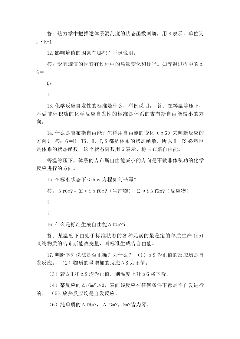 点这里,有很多篇《第2章化学热力学初步(习趣解95》在线阅读本文:htp:/3y.uu456.com/bp9y2jk4pg891h1yk7proe_2.html第2章化学热力学初步(习题解)95收或放出的热量:当反应物与生产物气体的物质的量相等时,或反应物与:不相等:△△U=△rHm?一△vRT:=164-(2-2-1)×298×8.314×1:=161.5KJ·mo1一1:7.什么叫标准生产热△fHm??什么是标准燃烧然;在100kPa的压强下1mol物质完全燃烧时的热:8.何谓盖斯定律?答:盖斯定律指一个化学反应如果:10.用焓变判断反应的自发收或放出的热量。当反应物与生产物气体的物质的量相等时,或反应物与生产物全是固体或液体时,恒压反应热与恒容反应热相等。不相等。因为氨是弱碱,电离需要吸热。②△rHm?=△rUm十△vRT△△U=△rHm?-△vRT=164-(2-2-1)×298×8.314×10-3=161.5KJ·mo1-17.什么叫标准生产热△fHm??什么是标准燃烧然△cHm?答:某温度下,由处于标准状态的各种元素的最稳定的单质生产标准状态下单位物质的量(1mo1)某纯物质的热效应叫这种温度下该纯物质的标准摩尔生成热,或简称标准生成热。在100kPa的压强下1mo1物质完全燃烧时的热效应叫做该物质的标准摩尔燃烧然,简称标准燃烧然。8.何谓盖斯定律?答:盖斯定律指一个化学反应如果能分解几步来完成,总反应的焓变等于各步分反应的焓变之和。10.用焓变判断反应的自发性为什么是不全面的?答:等温等压下,体系的吉布斯自由能减小的方向是不做非体积功的化学反应进行的方向。而根据G的定义式,G=H-TS,在等温等压条件下,△G△HT△S,△G综合了△H和△S,所以用焓变来判断反应的自发性是不全面的。11.什么是熵?什么是绝对熵和标准熵?其符号,单位是什么?