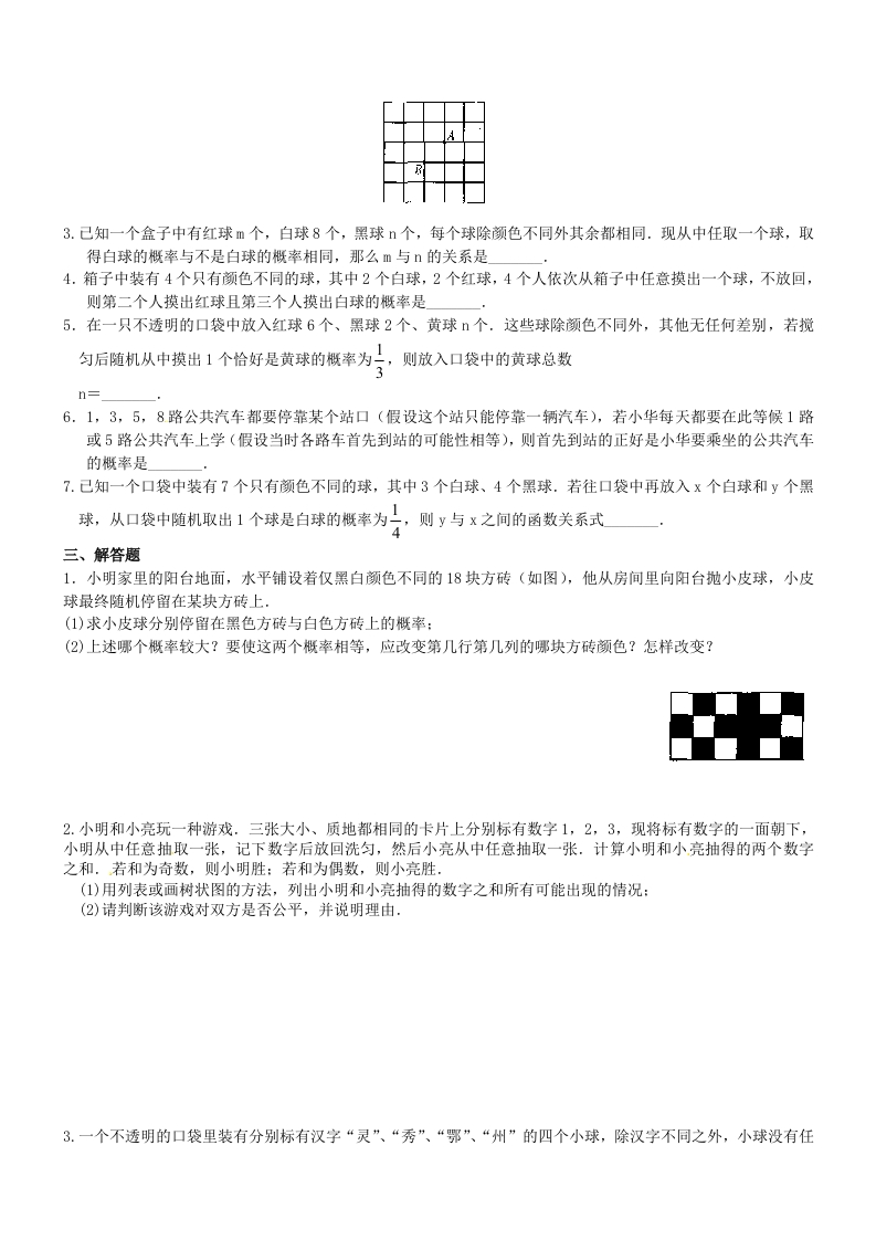 第4章等可能条件下的概率一、选择题1.小明和3个女生、4个男生玩丢手绢的游戏,如果小明随意将手绢丢在一名同学后面,那么这名同学不是女生的概率是A.3c.44B.372.有六张卡片,上面各写有1,1,2,3,4,4六个数,从中任意摸一张,摸到奇数的概率是()233.若用3,4.5三个数字组成一个三位数,则组成的数是偶数的概率是c.54.掷两枚普通的正六面体骰子,所得点数之和为11的概率为()A.1B.1c11218D.365.从一只装有4个红球的袋中随机摸出1个球,若摸到白球的概率为P,摸到红球的概率为P2,则()A.P2=P2=1B.P=0,P2=1C.P=0,P=40.R==月6.如图所示的是用相同的正方形砖铺成的地板,一宝物藏在某一块下面,则宝物在白色区域的概率是()1A.B.269cD.5第6题田97.小英同时掷甲、乙两枚质地均匀的小立方体(立方体的每个面上分别标有数字1,2,3,4,5,6).记甲立方体朝上一面上的数字为x、乙立方体朝上一面朝上的数字为y,这样就确定点P的一个坐标(x,y),那么点P落在双曲线y=5上的概率为()1B.2c.ID.968.一个盒子里有完全相同的三个小球,球上分别标上数字一1,1,2现随机摸出一个小球(不放回)其数字记为P,再随机摸出另一个小球其数字记为q,则满足关于x的方程x+px+q=0有实数根的概率是()1B.=C.2D.236二、填空题1.一个不透明的袋子中装有三个小球,它们除分别标有的数字1,3,5不同外,其他完全相同.任意从袋子中摸出一球后放回,再任意摸出一球,则两次摸出的球所标数字之和为6的概率是2.如图所示,A,B是边长为1的小正方形组成的网格的两个格点,在格点中任意放置点C,恰好能使△ABC的面积为1的概率是