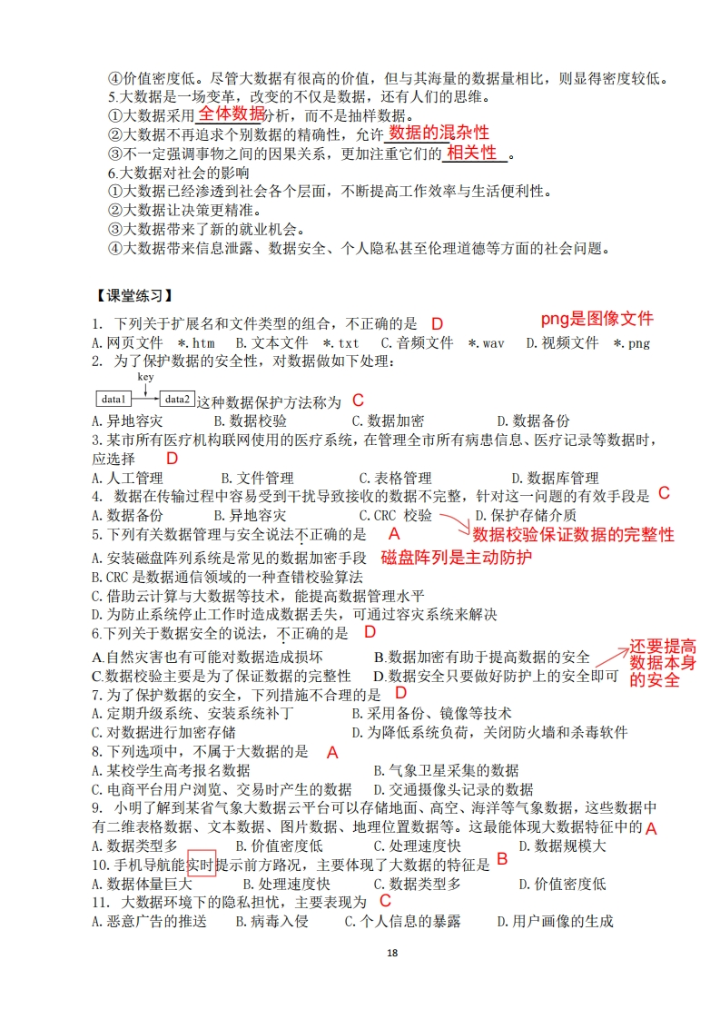 课堂练习答案:1-5 DCDCA6-11 DDAABC课后作业答案:1-5 DBBCD6-10 ABADC11-15CADAD 16-19AAAB1.4数据管理与安全1.5数据与大数据【课时目标】1.能选择合适的方法管理数据,理解文件的基本属性。2.了解数据保护的一般方法,提高数据安全意识。3.了解大数据的概念,理解大数据的特征。4.了解大数据对人类思维方式的影响,能正确面对大数据。【知识梳理-课前预习】一、数据管理与安全1数据管理是利用计算机硬件和软件技术对数据进行有效收集、存储、处理和应用的过程,其目的在于充分、有效地发挥数据的作用。2.在大数据出现之前,计算机数据的管理已经经历了人工管理、文件管理和数据库管理三个阶段。3数据一般以文件的形式存储。根据编码规则的不同,文件的格式也不相同,可以用文件扩展名来表示某些特定的文件类型,如网页文件的文件扩展名为.htm或.html,而JPEG图像文件扩展名为Pg等,以区分不同类型的存储数据,如文本、图像、音频等。文件类型扩展名文本文件.txt .doc.doex.wps.pdf图像文件.bmp .jpg.gif.psd.png.tif声音文件.wav .mid .mp3 .wma视频文件.avi .mpg.flv .mov .dat .rm.rmvb .wmv网页文件htm .html4.计算机一般采用树形目录结构来管理文件。在Windows系统中则采用了更为形象的文件夹来管理文件。5.传统数据库技术基于结构化数据进行开发,凭借数据独立性、数据可共享等特点,成为现代社会数据管理的主要方式,在安全性、易使用、可靠性等方面都取得了令人瞩目的成绩。6.数据管理技术不断发生着变化,目前借助云计算、大数据来管理大量半结构化、非结构化数据。7威胁数据安全的因素有很多,如硬盘驱动器损坏、操作失误、黑客入侵、感染计算机病毒、遭受自然灾害等。8.目前主要是采用主动防护的手段保护政府部门或企业的数据安全,如通过磁盘阵列、数据备份、异地容灾等手段,来保证数据的安全。9对于数据安全,不仅要做好防护上的安全,还应提高数据本身的安全,如通过数据加密数据校验等方法,可以提高数据的保密性和完整性。10.所谓数据加密,是指通过加密算法和加密密钥将明文转变为密文,而解密则是通过解密算法和解密密钥将密文恢复为明文。11.所谓数据校验是为保证数据的完整性进行的一种验证操作,通常用一种指定的算法对原始数据计算一个校验值,接收方用同样的算法计算一个校验值,如果两次计算得到的检验值相同,则说明数据是完整的。常见的数据校验方法有MD5、CRC、SHA一1等。二、数据与大数据1符合大数据概念的数据一般具有数据规模大处理速度快、数据类型多、价值密度低四个特征,可以用4个V来概括,即数量(Volume)、速度Velocity)、多样(Variety)和价值(Value)。①数据体量巨大。大数据的数据量庞大,其存储单位需要用到EB、ZB级别,且时刻在增长中。②速度快。速度快不仅是指数据产生的速度快,还指数据处理速度快。③数据类型多。大数据来源多样,其数据往往是多种形式共存。1>