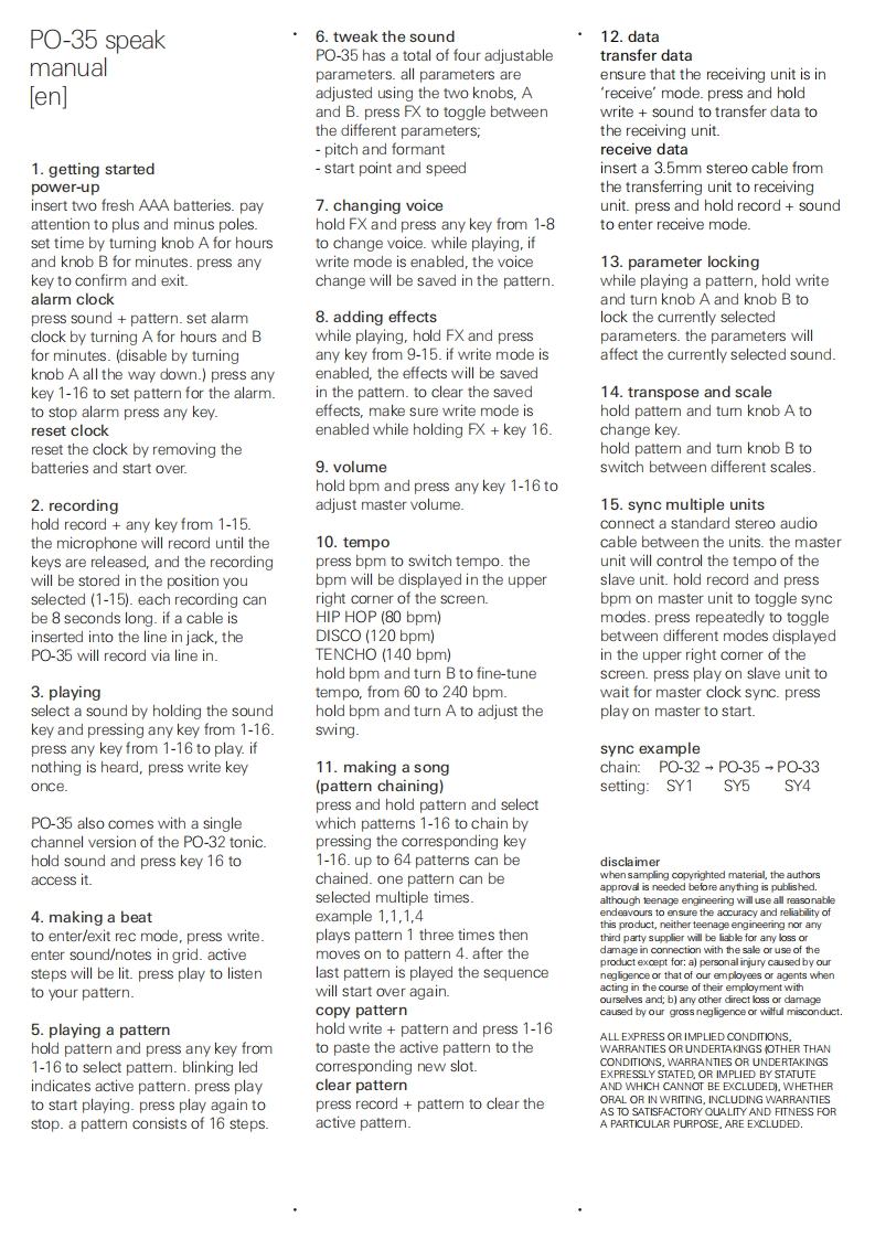 PO-35 speakmanual[en]break awayhangerpocket operatorbuilt-inmicrophonespeak鱼timelock tab000000000000000▣additional infofolding standplay rec modemos acinesoundselected tempoto select sound hold日®回RUA⑧sound and press 1-160000000000000000soundalarmparameters A/Bpatternto select pattem holdknob A/Bpattern and press 1-16sound pattern bpm mbpmrecordpress to select tempo3recordmeffectshold to set master volume 1-16to use effiects hold FXhold step 1-16+mand press 1-16to set multiplierpress FX to toggle mode56FXfor knob A/Bvoice 1-8play stopsound 1-16playpattern 1-16.writeeffects 9-16314I6μtonicwritevoice 1-8effects 9-161.neutral9.stutter sweepauto power off (a.p.o.)2.autotune10.trance gatethe unit auto powers off when no buttons3.retro11.half rateare pressed for a while,only poweringthe display to show time.4.noise12.16 bar build uppress sound bpm to show battery status.5.robot13.6/8 quantize6.fifth14.retrigger patternlock tab7.vocoder15.reversebreak off the lock tab to freeze all patternsand sounds.to reverse,solder the two8.synth16.no effectpads by the lock tab together.to restore tolocked settings,remove the batteries.2017 teenage engineering ab.all rights reserved.REV.A
