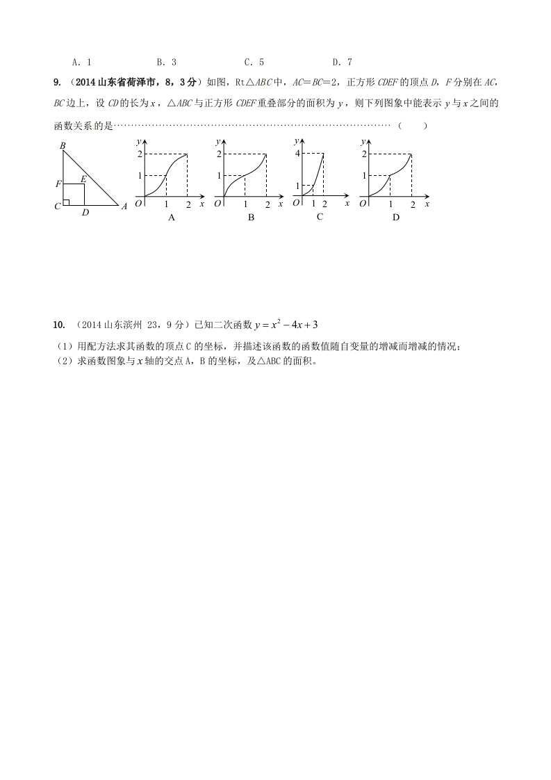 4ac③当a<0时,抛物线与x轴必有一个交点在点(1,0)的右侧:④抛物线的对称轴为x=-上,其中结论正确的个数有()AaA.4个B.3个C.2个D.1个6.(2014年维吾尔自治区,6,5分)对于二次函数y=(x-1+2的图象,下列说法正确的是()A.开口向下B.对称轴是1C.顶点坐标是(1,2)D.与x轴有两个交点7.(2014四川省达州市,10,3分)右图是二次函数y=ax2+bx+c的图象的一部分,对称轴是直线x=1①b2>4ac②4a-2b+c<0③不等式ax2+bx+c>0的解集是x≥3.5④若(-2,y),(⑤,y)是抛物线上的两点,则y