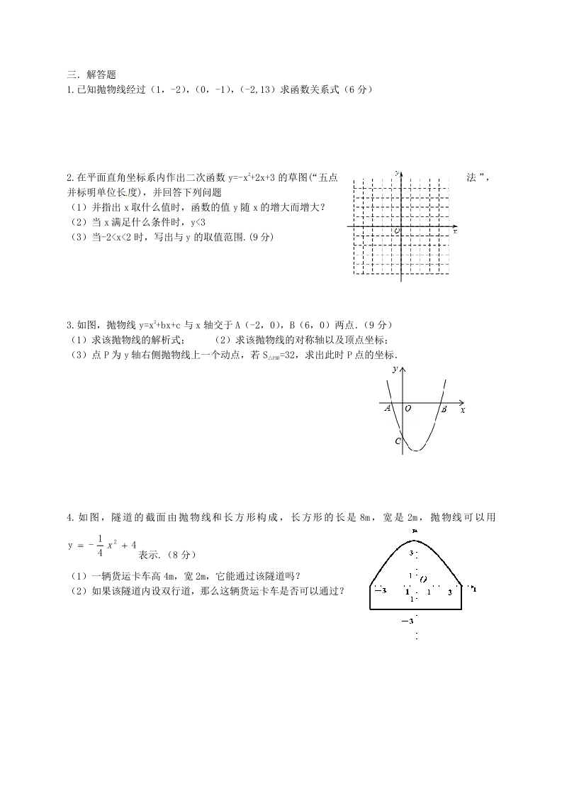 二次函数一.选择题(18)1.下列各式中,y是x的二次函数的是(A.y=mx2+1 (m0)B.y=ax'+bx+cC.y=(x-2)2-x2D.y=3x-12.二次函数y=(x+2)2-1的图象大致为(3.对于二次函数y=-x2+2x.有下列四个结论:①它的对称轴是直线x=1:②设y=-x2+2x1,y2=-x2+2x2,则当x>x时,有y2>y:③它的图象与x轴的两个交点是(0,0)和(2,0):④当00.其中正确的结论是()A.①②③④B.①③④C.③④D.①②④4.二次函数y=ax2+bx+c(a≠0)的图象如图所示,下列结论:①2a+b>0:②abc<0:③b2-4ac>0:④a+b+c<0:⑤4a-2b+c<0,其中正确的个数是()A.2B.3C.4D.55.己知二次函数y=x2+(m-1)x+1,当x>1时,y随x的增大而增大,而m的取值范围是()A.m=-1B.m=3C.m≤-1D.m≥-16.二次函数y=x2十mx十n,若m十n=0,则它的图象必经过点()A.(-1,1)B.(1,-1)C.(-1,-1)D.(1,1)二.填空题(26)1.当k=时,函数y=(k-2)x“-2+(k+2)x-1为二次函数2.二次函数y=(x-2)24与x轴的交点坐标是,与轴的交点坐标是3.将二次函数y=(x-1)+3图象沿x轴向左平移2个单位,再向上平移3个,则平移后的抛物线对应的二次函数的表达式为4.己知抛物线的顶点为(-1,3),且过点(2,0),则抛物线的表达式为5.若二次函数y=kx2-6x+3的图象与x轴有交点,则k的取值范围是6.抛物线y=ax2+bx+2经过点(-2,3),则2a-b=7.己知点A(4,y),B(V2,y2),C(-2,ya)都在二次函数y=(x2)2-k的图象上,则y、yy的大小关系是8.某种火箭被竖直向上发射时,它的高度h(m)与时间t(s)的关系可以用公式F-5t+150t+10表示.经过s,火箭达到它的最高点.9.二次函数y=ax-2ax+3的图象与x轴有两个交点,其中一点坐标为(-1,0),则一元二次方程ax2-2ax+3=0的解为10.己知二次函数y=x2一6x+m的最小值为1,则m的值是若顶点在x轴上,则m=11.如图,在平面直角坐标系中,点A在抛物线y=x2-2x+2上运动.过点A作AC⊥x轴于点C,以AC为对角线作矩形ABCD,连结BD,则对角线BD的最小值为