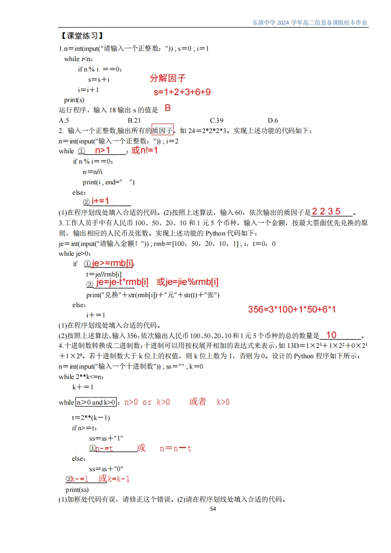 课堂练习:见内页课后作业:1-5 BCDC6-10 BCDDC乐清中学2024学年高二信息备课组校本作业绿时6 w hile循环语句及程序实现【课时目标】l.掌握while循环语句的语法格式,理解while循环的功能。2.熟练使用while循环语句解决实际问题【知识梳理-课前预习】l.while循环的功能Wile循环在执行时,首先会判断条件是否为真,如果条件为真,执行一次循环体,再次判断条件是否为真,如果仍为真,那么再执行一次循环体,以此类推,直到条件为假时退出while语句。2.while循环语句格式while〈条件):(循环体)3.while循环适用场合(1)循环次数未知,但循环结束的条件已知。(2)循环条件有两个或两个以上。注意:①在h川ē循环前应对变量赋初值。②循环变量的变化要在循环体内通过赋值语句来实现。【上机练习】从键盘读入一串字符,输出非元音字母,遇到字母q或Q跳出循环,结束程序。input提示:请物入任意一段英文:输入:rueqing middle school输出:ygfor语句的写法while语句的写法strl=input("请输入任意一段英文:")strl=iput(请输入任意一段英文:")for ch in strl:1=0if ch in "aeiouAEIOU":while i1print(n,end="-")ifn%2=0:n=n/2else:n=3*n+1print(n)53