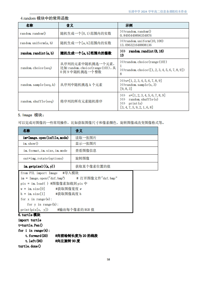 课堂练习:1.B2.(1)ord(s)-65+tn=n-26或n=n%26(2)C3.B4.D5.①D2A3B4C课后作业:1-5 DBBAD6-9BBCB乐清中学2024学年高二信息备课组校本作业10.(1)no solution20xeD②8turn1③nmsi1条对7g通款与挨块【课时目标】1.掌握自定义函数的构造和调用方法。2.掌握模块的导入方法和常用函数的应用。【知识梳理-课前预习】一、函数的构造及应用(1)函数是组织好的、可重复使用的、用来实现特定功能的代码段,通过函数名来表示和调用。使用函数主要有两个目的:降低编程难度和增加代码复用。(2)Python语言通过保留字def定义函数,语法格式如下:def函数名(参数集合):<函数体〉[return函数值](3)函数定义注意事项。①函数代码块以df开头,后接函数名和圆括号。函数名的命名规则和变量名一样。②参数列表是程序调用该函数时传递给它的值,可以有0个、1个或多个参数,当传递多个参数时,逗号分隔。③函数体以冒号起始并且有缩进,是函数每次被调用时执行的代码,由一行或多行语句组成。④如果函数需要返回值,使用保留字return和返回值列表,选择性地返回一个值给调用方。不带return的表达式相当于返回None,函数体结束后会将控制权返回给调用者。⑤定义后的函数不能直接运行,需要经过调用才能运行。调用函数的基本方法为:函数名(实际◆数集合)。⑥每次调用函数可以提供不同的参数作为输入,以实现对不同数据的处理。函数执行后,可返回相应的处理结果。二、模块的导入及应用l.Python内置模块:数学运算math模块、生成随机数andom模块、图像Image模块。2.模块的导入可采用以下两种方法:方法一:import<模块l>,import<模块2>,…方法二:from<模块名>import<函数名>调用:<模块名>.<函数名>调用:<函数名>import mathfrom math import sqrtX=4X=4ans=math.sqrt(x)ans=sqrt(x)print(anx)print(anx)3.math模块中的常用常数与函数名称含义math.e自然常数emath.pi圆周率元math.ceil(x)对x向上取整,如math.ceil(4.1)的返回值为5math.floor(x)对x向下取整,如mah.floor((4.9)的返回值为4math.pow(x,y)指数运算,得到x的y次方,如math.pow(4,2)的返回值为16.0对数运算,默认基底为e,如math.log(math.e)的返回值为1.0,math.log(100,10)的math.log(x)返回值为2.0math.sin(x)正弦函数math.cos(x)余弦函数math.tan(x)正切函数math.degrees(x)弧度转换成角度,如math.degreest(math.pi2)的返回值为90.0math.radians(x)角度转换成弧度math.sqrt(x)对x算术平方根运算57