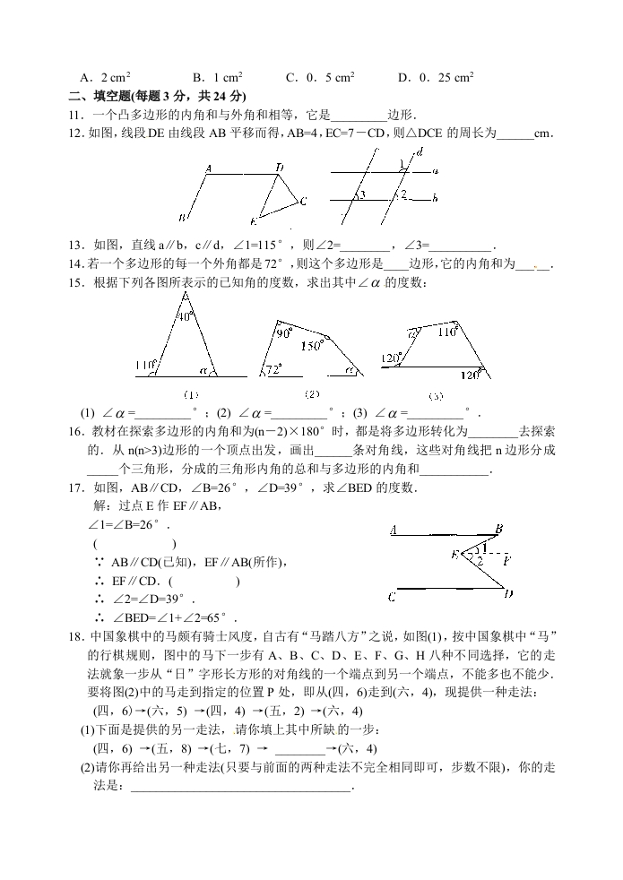 第7章《探索直线平行的条件》提高测试卷(2)(时间:90分钟满分:100分)一、选择题(每题2分,共20分)1,下列命题中,不正确的是(A.如果两条直线都和第三条直线平行,那么这两条直线也互相平行B.两条直线被第三条直线所截,如果同位角相等,那么这两条直线平行C.两条直线被第三条直线所截,那么这两条直线平行D.两条直线被第三条直线所截,如果同旁内角互补,那么这两条直线平行2.△ABC的高的交点一定在外部的是().A.锐角三角形B.钝角三角形C.直角三角形D.有一个角是60°的三角形3.现有两根木棒,它们的长分别是40cm和50cm,若要钉或一个三角形木架,则在下列四根木棒中应选取().A.10cm的木棒B.40cm的木棒C.90cm的木棒D.100cm的木棒4.己知等腰三角形的两边长分别为3cm,4cm,则它的周长为().A.10cmB.11 cmC.10cm或11cmD.无法确定5,下列条件中,能判定△ABC为直角三角形的是(A.∠A=2∠B一3∠CB.∠A+∠B=2∠CC.∠A一∠B=30D.∠A=5∠B=3∠C36.在四边形的4个内角中,钝角的个数最多为().A.1B.2C.3D.47.如图,己知直线AB∥CD,∠C=115°,∠A=25°,∠E=().A.70B.80C.90D.100ED(第7题)(第10题)8.一个多边形的内角和等于它外角和的2倍,则这个多边形是(A.三角形B.四边形C.五边形D.六边形9.若△ABC的三边长分别为整数,周长为11,且有一边长为4,则这个三角形的最大边长为()A.7B.6C.5D.410.在△ABC中,己知点D、E、F分别是边BC、AD、CE上的中点,且SAABC-=4cm2,则S△F的值为().