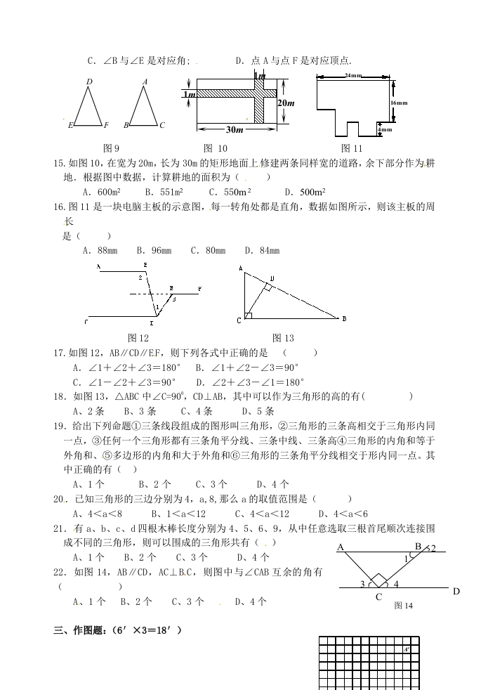 第7章《探索直线平行的条件》提高测试卷(4)班级姓名得分」一、填空:(3'×12=36')1.如图1,与∠1是同位角的角是,与∠1是内错角的角是,与∠1是同旁内角的角是图1图2图3图42.如图2,∠2与∠C是直线被直线所截得的同位角,∠与∠3是直线与被直线所截得的内错角,∠与∠A是直线AB与BC被直线所截得的同旁内角。3.如图3,①如果∠B=∠1,那么根据,可得AD∥BC:②如果∠D=∠1,那么根据,可得AB∥CD.4.如图4,①如果AD∥BC,那么根据两直线平行,同旁内角互补,得∠+∠ABC=180°:②如果AB∥CD,那么根据两直线平行,同旁内角互补,可得∠+∠ABC=180°5.如图5,平行直线a、b被直线1所截,如果∠1=75°,那么∠2=°,∠4=。,∠5=。,∠6=。,∠7=。,∠8=图5图66.如图6,用平移三角尺的方法可以检验出图中共有平行线对.7.如图7,△ABC是△DEF经过平移得到的,若AD=4cm,则BE=cm,CF=cm,若M为AB的中点,N为DE的中点,则N=cm.8.在一个三角形内角中最多有锐角,最多有钝角。9.△ABC中,∠A=∠B=∠C,则∠A=,∠B=,∠C=310.若多边形的边数增加3,则内角和在增加。,外角和11.如图8所示,试求∠A+∠DBE+∠C+∠D+∠E=12.一等腰三角形周长为13cm,其中有一条边长度为3cm,则该三角形另两边长度分别是cm和cm图8E二、选择题:(3'×10=30')13.下列五幅图案中,(2)、(3)、(4)、(⑤)中的哪个图案可以由(1)图案平移得到?(A.(2)B.(3)C.(4)D.(5)14.如图9,等腰△DEF是由等腰△ABC平移得到的,A.AB与EF是对应线段:B.AB与