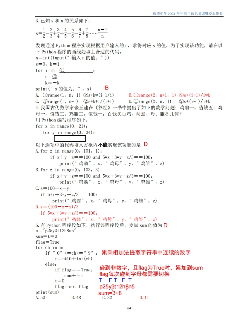 课堂练习:1-5 BBBDD课后作业:15 CABBA6ZBA乐清中学2024学年高二信息备课组校本作业8.(1)1,2,3,4,5,7,10,11,12绿财8解折、枚举算法及程序实现(2)num=num*10+int(s[i]))fiag-True rs+=str(end+,或rs+=str(num)+",【课时目标】9.(1)31(2)pa+=2b[pb+i]=a[pa+2]range(1,pb)1.掌握解析和枚举算法的基本思想。2.掌握使用解析和枚举算法解决实际问题的基本方法,并通过编写程序实现问题求解。【知识梳理-课前预习】一、解析算法的基本思想解析算法的基本思想是指根据问题的前提条件与所求结果之间的关系,找出求解问题的数学表达式,并通过表达式的计算来实现问题的求解。二、解析算法解题的基本思路1.建立正确的数学模型,即得出正确的数学代数式。2.将数学代数式转化为Pytho式子。三、解析算法程序实现的步骤1运用解析算法分析问题,寻找问题中各要素之间的关系,用数学表达式表示它们的关系。2写出解决问题的解析步骤,编写程序实现,通过运行程序求得问题的正确解。四、枚举算法的基本思想枚举算法的基本思想是把问题所有可能的解一一列举,然后判断每一个列举出的可能邂是否为正确的解。枚举算法常用于解决是否存在或有多少种可能等类型的问题。五、枚举算法的基本框架1.枚举算法三要素:枚举范围、枚举对象、判断条件。2.基本框架:枚举范围是用来表示枚举对象存在的一个连续区间,用循环结构语句实现。判断条件用来检测当前枚举的对象是否为问题的解。六、Python文件的读写操作(1)打开/读取文件。①以读("r")的方式打开文件“test.txt”,其他常见的文件模式还有写("w")、读写("w+")和追加("a")等。如:f=open("test.xt","r")②每次读取整个文件,它通常将读取到的文件内容放到一个字符串变量中,方便一次性读取,返回字符串类型。如:f.read0,也可以每次最多读size个字节内容如f.read(size)③函数每次只读取文件的一行,通常将读取到的一行内容放到一个字符串变量中,并按行返回列表,配置文件使用该方法最方便。如:for line in f.readlines():(2)写入文件。print(line.strip(")#把末尾“n”删除with open("test.txt","w")as f.f.write("需要写入的文字")①write(0需要传入一个字符串作为参数,否则会报错。②写入文件与读取文件类似,只不过模式用“w”表示。写入模式中,如果要写入的文件为空文件则直接写入:若文件中已经存在内容,那么旧内容将会被覆盖,若不想被覆盖则需要将模式改为“a”。(3)关闭文件的方法是f.close()。【课堂练习】1.计算圆周长的算法描述如下:①输入圆半径r;②计算圆周长(计算公式为p=2*pir);③输出结果;④结束则该算法属于BA.枚举算法B.解析算法C排序算法D.查找算法2.下列问题中,适合使用解析算法求解的BCA.求正整数n所有因数B.已知一元二次方程的三个系数,求方程的解C.已知两个整数a和b,求它们的最大公约数D.找出一筐乒乓球中质量不符合标准的球63