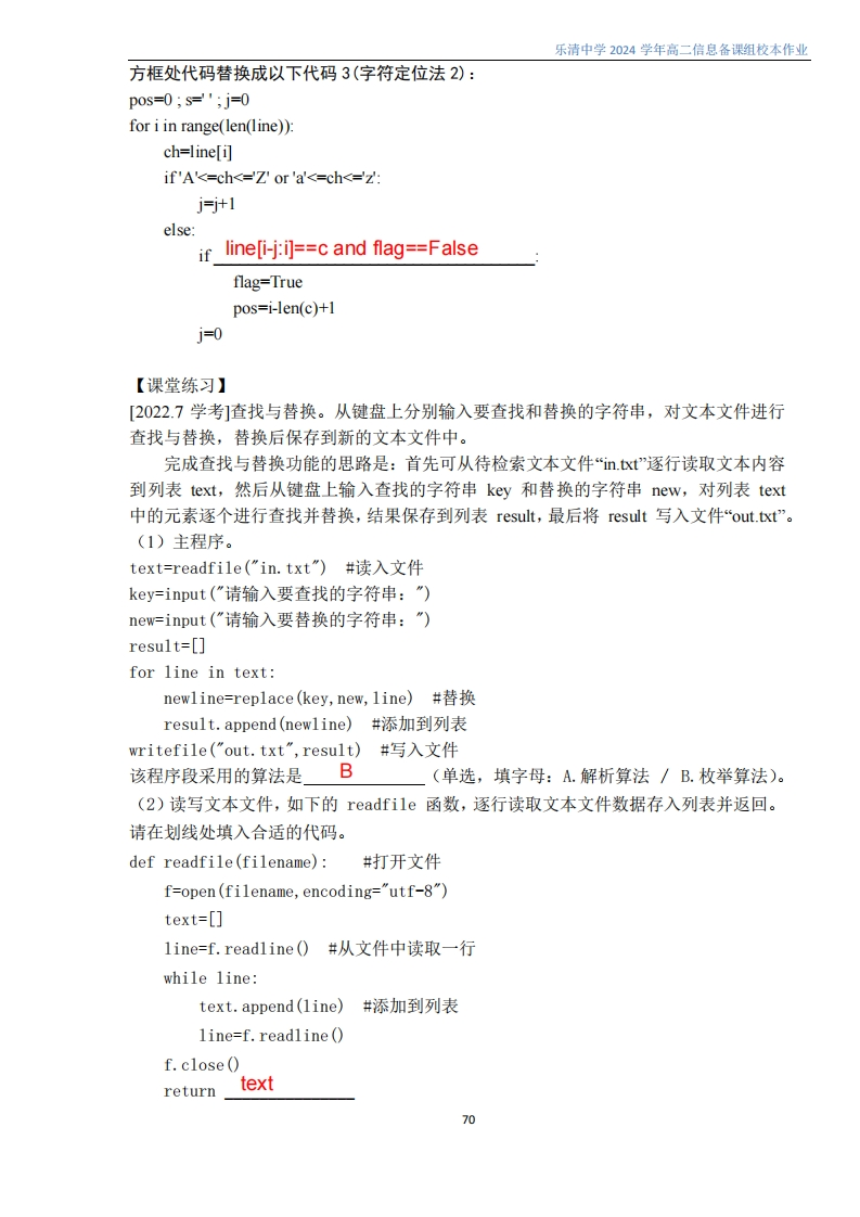乐清中学2024学年高二信息备课组校本作业课时9算法程序实现的棕合应用—一字符提取【例题】查找在一行文字查找指定的单词,若找到,则返回该单词第一次出现的文字,找不到则返回“找不到该单词”。It was Sunday.I never get up early on Sundays.I sometimes stay in bed until lunch time.Last Sunday I got up very late.I looked out of the window.It was dark outside.What a day!"I thought.'It's raining again.'Just then,the telephone rang.It was my aunt Lucy.'I've just arrived by train,'she said.I'm coming to see you.'"But I'm still having breakfast,'I said.What are you doing ?"she asked.'I'm having breakfast,I repeated.Dear me,'she said.'Do you always get up so late?It's one o'clock!"t1.xt内容如上图所示It was Sunday.I never get up early on Sundays.I sometimes stay in bed until lunch time.请输入要查找的单词:early要找的单词第一次出现的位置是第30位程序运行界面如上图所示代码1(字符连接法)程序如下:f=open('tl.txt','r')line=f.readline()print(line)c-input("请输入要查找的单词:")flag=Falsep0s=0;s=';t=for i in range(len(line)):ch=line[i]if'A'<=ch<=Z'or'a'<=ch<='Z':tt+ch或t+=chelse:ift==c and flag==False此处加brea可flag=True以让循环停pos=i-len(t)+1或pos=iHen(c)+1找到就不找if flag:print("要找的单词第一次出现的位置是第",pos,"位")else:print("找不到该单词")方框处代码替换成以下代码2(字符定位法1):p0s=0;s=';t=';j=0for i in range(len(line))ch=line[i]if not('A'<=ch<='Z'or'a'<=ch<=Z):t=line[j:i]j=计1ift==c and flag==False:flag=Truepos=i-len(c)+169